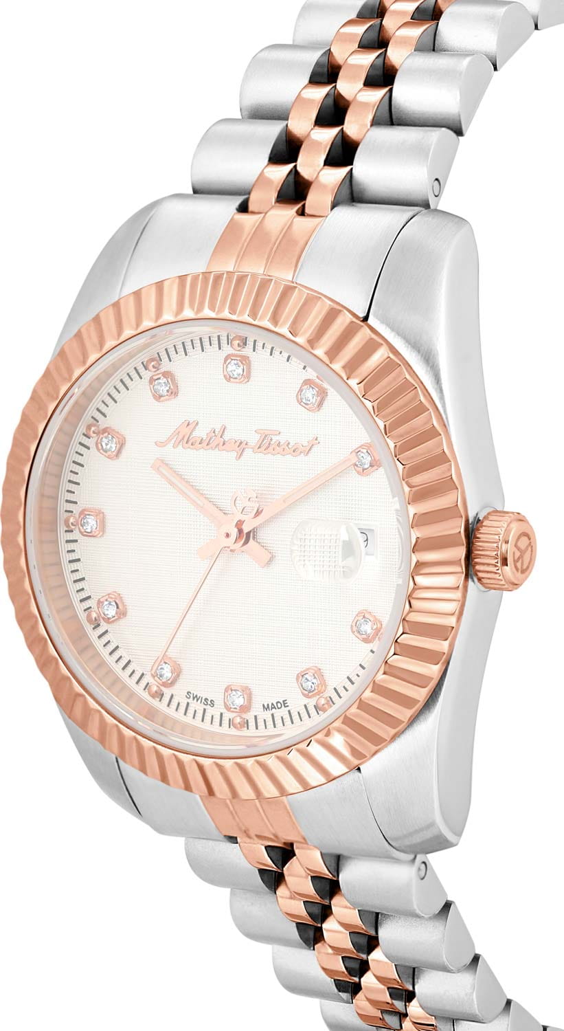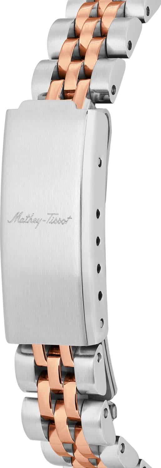 Женские кварцевые часы Mathey-Tissot Rolly D810RA — это стильное сочетание элегантности и современного дизайна. Изящный корпус выполнен из нержавеющей стали, диаметром 30 мм, что придаст образу женственности и романтизма. Изысканный циферблат с метками в виде точек придает модели особый блеск. Циферблат защищен минеральным стекломМинеральное стеклоМинеральное стекло представляет собой искусственно выращенный минерал кварца. Такое стекло отличается особой устойчивостью к повреждениям и царапинам. Уступает по некоторым качествам сапфировому стеклу., обеспечивающий устойчивость к царапинам. Стрелки с люминесцентным покрытиемЛюминесцентное покрытиеПозволяет считывать показания времени в темноте. Производители наносят на стрелки, часовые индексы, безель или поверхность циферблата светонакопительный состав, дающий холодное свечение.. Рифленый безельБезельВнешний ободок, закрепляющий стекло. В спортивных часах так называется поворотное кольцо с делениями на циферблате, выполняет роль таймера – замеряет отрезки времени на шкале. Неподвижный безель – элемент декора. Однонаправленно вращающийся безель на дайверских часах позволяет фиксировать моменты погружения и выныривания на поверхность. с PVD-покрытиемPVDУльтратонкое покрытие наносится в технике вакуумного напыления, сочетает в себе нитрид титана особой прочности со слоем золота или оксида хрома. Несёт в себе декоративную или защитную функцию. цвета розового золота. Циферблат украшен кристаллами. Окошко даты находится в положении 3 часа. Часы оснащены надежным кварцевым механизмом. Стальной браслет с частичным PVD-покрытиемPVDУльтратонкое покрытие наносится в технике вакуумного напыления, сочетает в себе нитрид титана особой прочности со слоем золота или оксида хрома. Несёт в себе декоративную или защитную функцию. на раскладной застёжкеРаскладная застёжкаТакой тип застёжки используется только на браслетах из металла. Она никогда не раскрывается полностью, происходит разделение на 2 и более частей. Раскладывающая застёжка снизит вероятность потери часов к минимуму., гарантирует комфортное и безопасное ношение. Класс водозащиты: 50 метров позволит защитить корпус от случайных брызг или капель дождя. Mathey-Tissot  — отличный выбор для тех, кто ценит утонченность и качество.