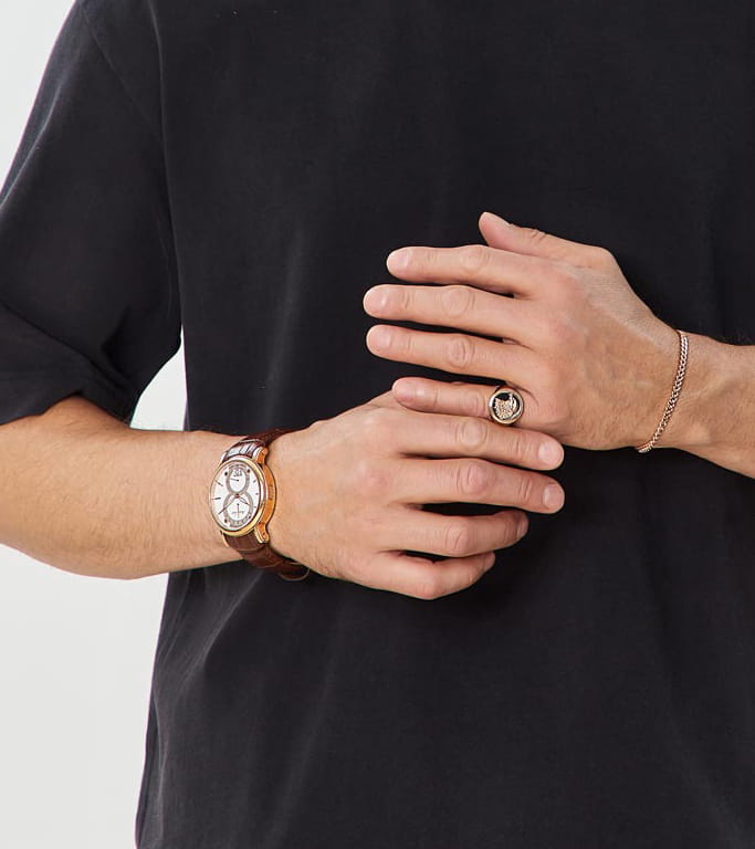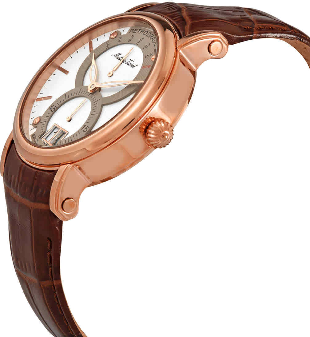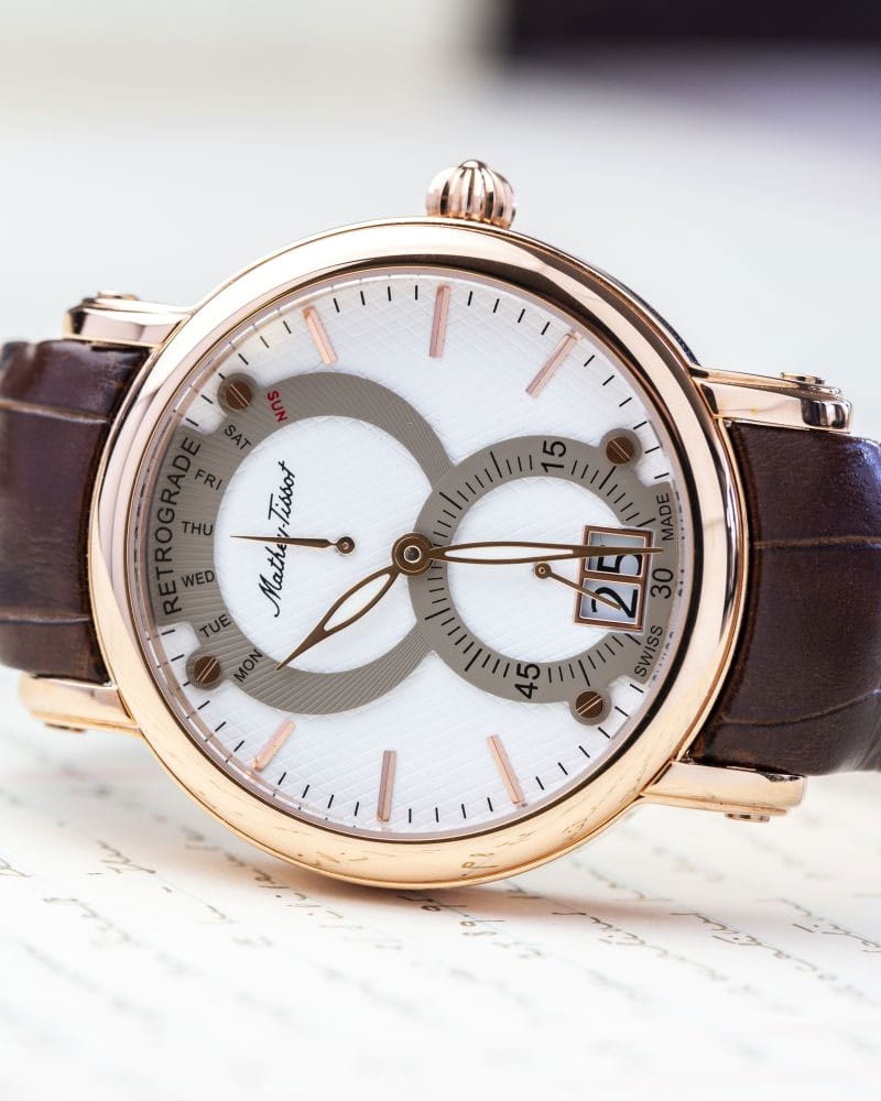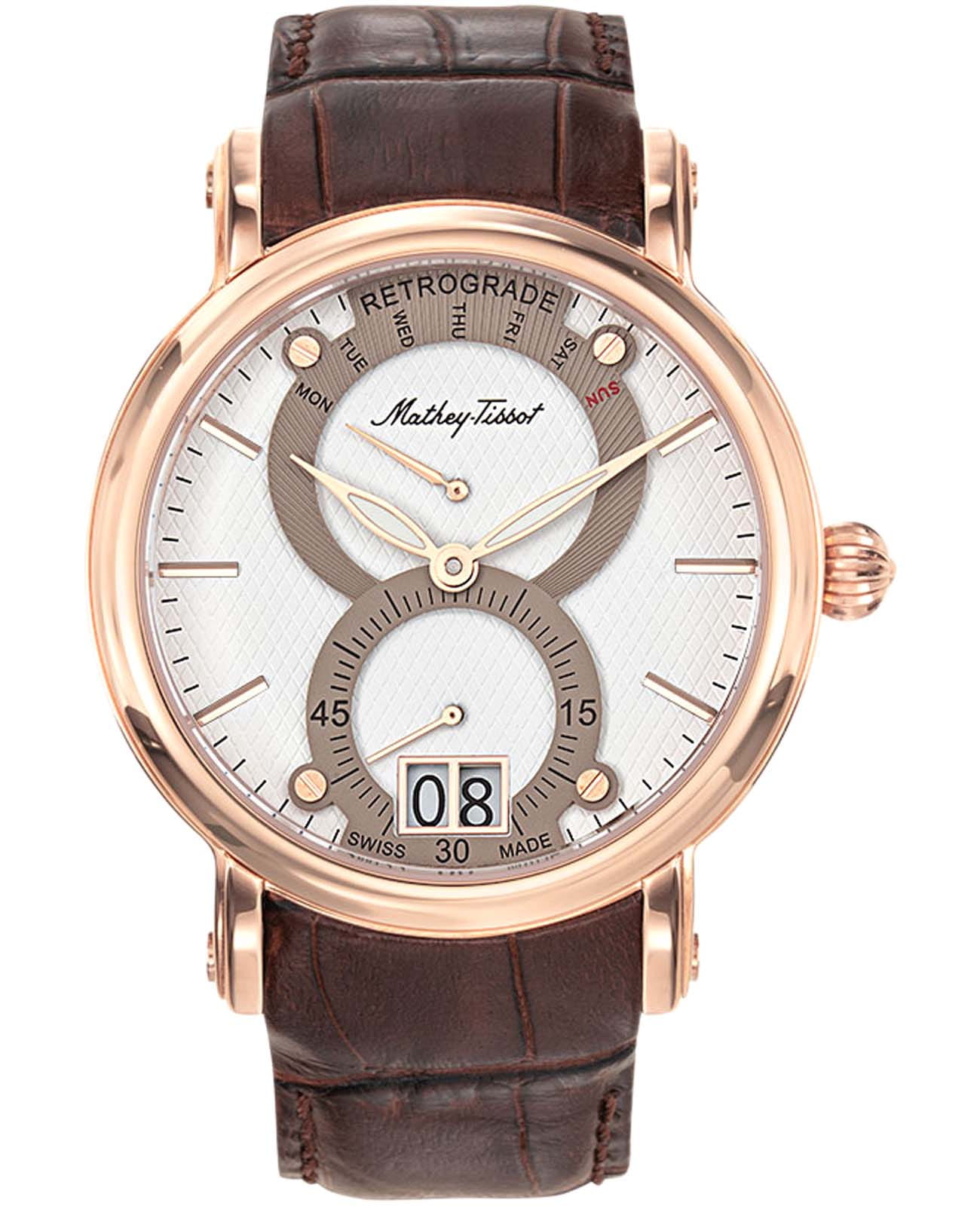 Mathey-Tissot Retrograde H7022PI — практичные часы с ярким дизайном и ретроградным указателем дня недели станут отличным вариантом на каждый день. Изящный корпус выполнен из нержавеющей стали с PVD-покрытиемPVDУльтратонкое покрытие наносится в технике вакуумного напыления, сочетает в себе нитрид титана особой прочности со слоем золота или оксида хрома. Несёт в себе декоративную или защитную функцию. цвета розового золота, диаметром 43 мм, что придаст образу элегантности и надежности. Изысканный циферблат с метками в виде штрихов придает модели особый блеск. Циферблат защищен минеральным стекломМинеральное стеклоМинеральное стекло представляет собой искусственно выращенный минерал кварца. Такое стекло отличается особой устойчивостью к повреждениям и царапинам. Уступает по некоторым качествам сапфировому стеклу., обеспечивает устойчивость к царапинам. Стрелки с люминесцентным покрытиемЛюминесцентное покрытиеПозволяет считывать показания времени в темноте. Производители наносят на стрелки, часовые индексы, безель или поверхность циферблата светонакопительный состав, дающий холодное свечение.. Окошко даты находится в положении 6 часов. Часы оснащены надежным кварцевым механизмом. Кожаный ремешок на раскладной застёжкеРаскладная застёжкаТакой тип застёжки используется только на браслетах из металла. Она никогда не раскрывается полностью, происходит разделение на 2 и более частей. Раскладывающая застёжка снизит вероятность потери часов к минимуму. гарантирует комфортное и безопасное ношение. Класс водозащиты: 50 метров позволит защитить корпус от случайных брызг или капель дождя. Mathey-Tissot  — отличный выбор для тех, кто ценит утонченность и качество.