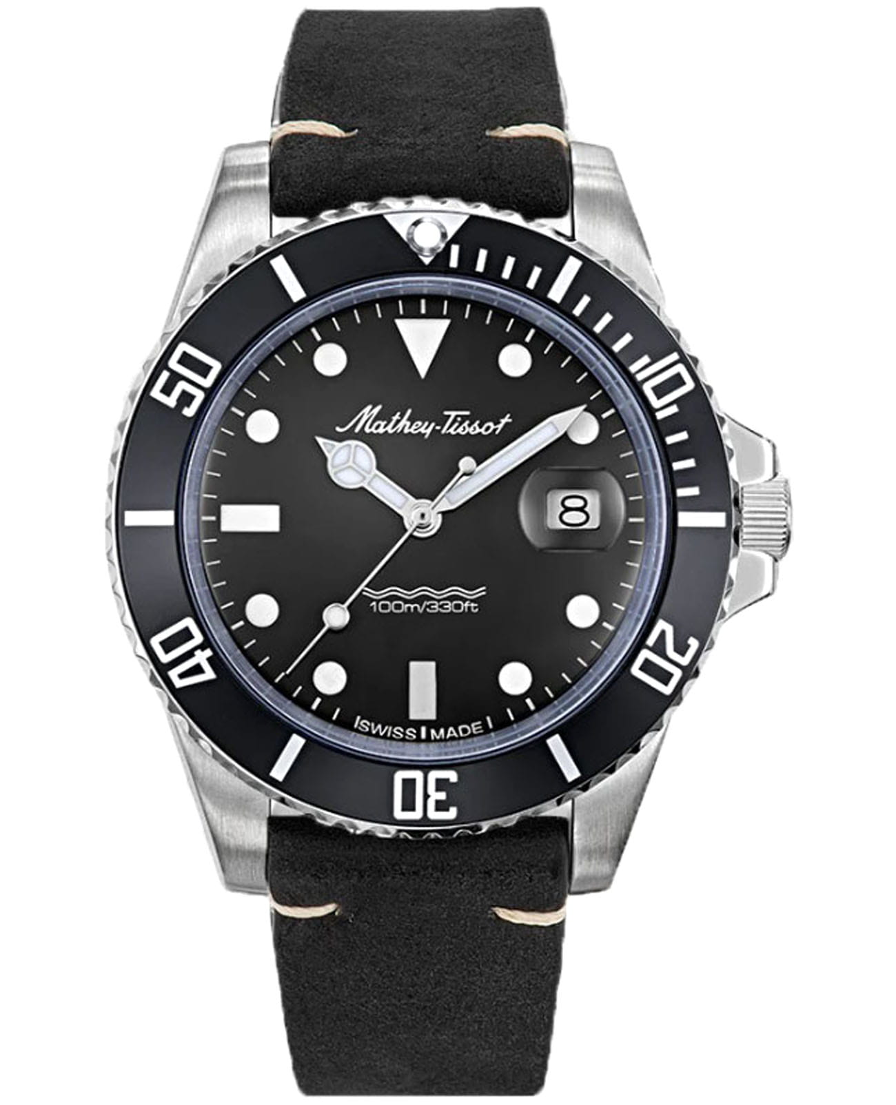 Мужские кварцевые часы Mathey-Tissot Mathy H901ALN — это стильное сочетание элегантности и современного дизайна. Изящный корпус выполнен из нержавеющей стали, диаметром 42 мм, что придаст образу элегантности и надежности. Циферблат с метками в виде точек придает модели особый блеск. Циферблат защищен минеральным стекломМинеральное стеклоМинеральное стекло представляет собой искусственно выращенный минерал кварца. Такое стекло отличается особой устойчивостью к повреждениям и царапинам. Уступает по некоторым качествам сапфировому стеклу. с сапфировым покрытием, обеспечивает устойчивость к царапинам. Стрелки и метки с люминесцентным покрытиемЛюминесцентное покрытиеПозволяет считывать показания времени в темноте. Производители наносят на стрелки, часовые индексы, безель или поверхность циферблата светонакопительный состав, дающий холодное свечение.. Окошко даты находится в положении 3 часа. БезельБезельВнешний ободок, закрепляющий стекло. В спортивных часах так называется поворотное кольцо с делениями на циферблате, выполняет роль таймера – замеряет отрезки времени на шкале. Неподвижный безель – элемент декора. Однонаправленно вращающийся безель на дайверских часах позволяет фиксировать моменты погружения и выныривания на поверхность. с PVD-покрытиемPVDУльтратонкое покрытие наносится в технике вакуумного напыления, сочетает в себе нитрид титана особой прочности со слоем золота или оксида хрома. Несёт в себе декоративную или защитную функцию. черного цвета. Часы оснащены надежным кварцевым механизмом. Кожаный ремешок на стандартной застежке гарантирует комфортное и безопасное ношение. Класс водозащиты: 100 метров позволит плавать, нырять и заниматься другими водными видами спорта. Mathey-Tissot  — отличный выбор для тех, кто ценит утонченность и качество.