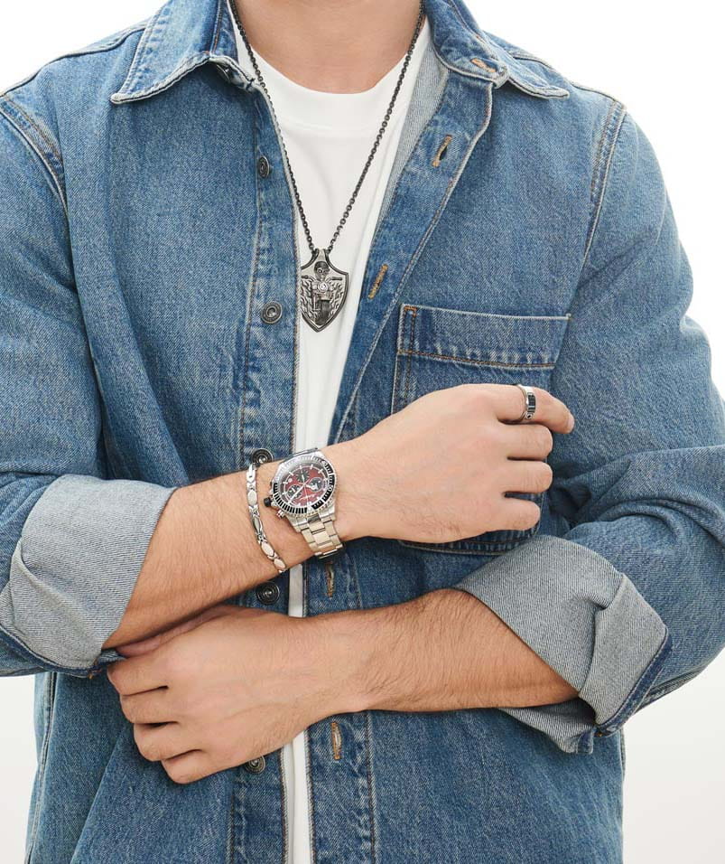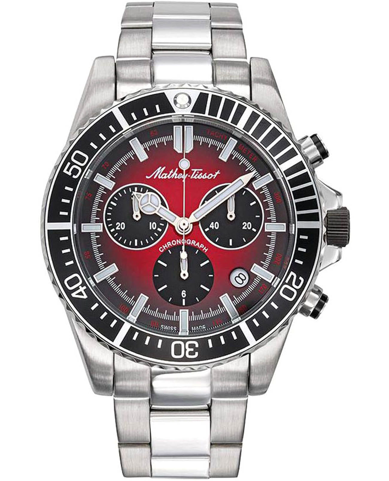 Мужские кварцевые часы-хронографХронографФункция позволяет измерять отрезки времени с особой точностью: часы, минуты, секунды. Верным признаком хронографа является наличие на циферблате 3 дополнительных окошек-счётчиков. с секундомеромСекундомерСекундоме́р — прибор, способный измерять интервалы времени с точностью до долей секунды. Mathey-Tissot Mathy H908CHAR — это стильное сочетание элегантности и современного дизайна. Изящный корпус выполнен из нержавеющей стали, диаметром 42 мм, что придаст образу элегантности и надежности. Изысканный циферблат с метками в виде штрихов придает модели особый блеск. Циферблат защищен минеральным стекломМинеральное стеклоМинеральное стекло представляет собой искусственно выращенный минерал кварца. Такое стекло отличается особой устойчивостью к повреждениям и царапинам. Уступает по некоторым качествам сапфировому стеклу. с сапфировым покрытием, обеспечивает устойчивость к царапинам. Стрелки и метки с люминесцентным покрытиемЛюминесцентное покрытиеПозволяет считывать показания времени в темноте. Производители наносят на стрелки, часовые индексы, безель или поверхность циферблата светонакопительный состав, дающий холодное свечение.. БезельБезельВнешний ободок, закрепляющий стекло. В спортивных часах так называется поворотное кольцо с делениями на циферблате, выполняет роль таймера – замеряет отрезки времени на шкале. Неподвижный безель – элемент декора. Однонаправленно вращающийся безель на дайверских часах позволяет фиксировать моменты погружения и выныривания на поверхность. с PVD-покрытиемPVDУльтратонкое покрытие наносится в технике вакуумного напыления, сочетает в себе нитрид титана особой прочности со слоем золота или оксида хрома. Несёт в себе декоративную или защитную функцию.. Окошко даты находится в положении между 4 и 5 часов. ТахиметрТахиметрРазмеченная шкала, располагается на ободке или безеле часов. Тахиметр позволяет рассчитать скорость на определённом участке пути, расстояние измеряется в километрах или милях. по внешнему краю. Стальной браслет на раскладной застёжке с фиксаторомРаскладная застёжкаТакой тип застёжки используется только на браслетах из металла. Она никогда не раскрывается полностью, происходит разделение на 2 и более частей. Раскладывающая застёжка снизит вероятность потери часов к минимуму., гарантирует комфортное и безопасное ношение. Рифленая заводная головка. Класс водозащиты: 100 метров позволит плавать, нырять и заниматься другими водными видами спорта. Mathey-Tissot  — отличный выбор для тех, кто ценит утонченность и качество.