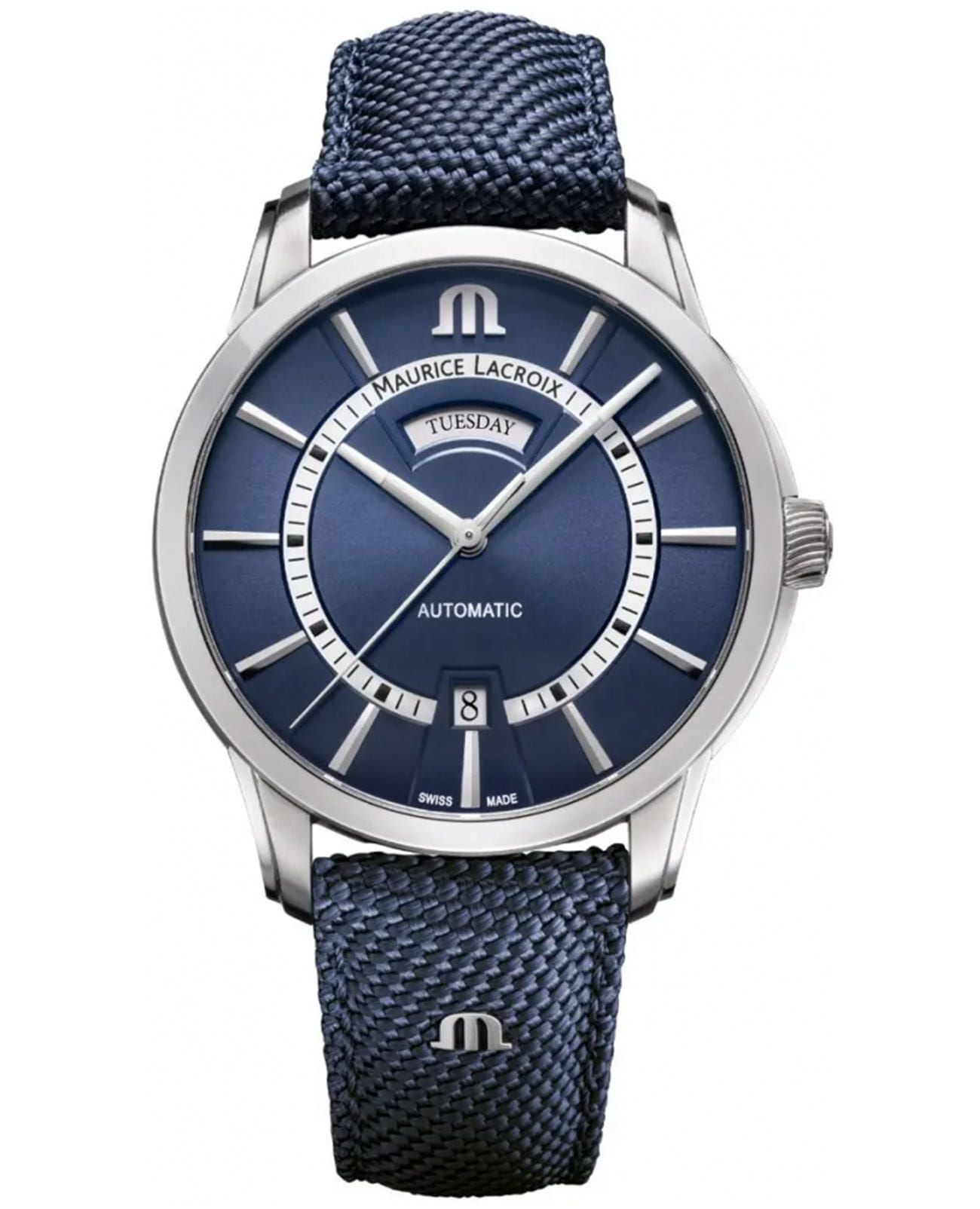 Мужские швейцарские часы Maurice Lacroix Pontos Day Date PT6358-SS004-431-4, механический механизм (автоматический калибр) с высокой точностью. Сапфировое стеклоСапфировое стеклоПрочный и надёжный материал из кристалла сапфира синтетического происхождения, характеризующийся особой твёрдостью и устойчивостью к царапинам и повреждениям. устойчивое к появлению царапин, обладающее высокой прозрачностью. Класс водозащиты: 100 метров, позволит плавать, нырять и заниматься другими водными видами спорта. Корпус часов изготовлен из стали. Тканевый ремешок на раскладной застёжкеРаскладная застёжкаТакой тип застёжки используется только на браслетах из металла. Она никогда не раскрывается полностью, происходит разделение на 2 и более частей. Раскладывающая застёжка снизит вероятность потери часов к минимуму.. Окошки дня недели и даты находятся в положении 12 и 6 часов. Стрелки с люминесцентным покрытиемЛюминесцентное покрытиеПозволяет считывать показания времени в темноте. Производители наносят на стрелки, часовые индексы, безель или поверхность циферблата светонакопительный состав, дающий холодное свечение..
