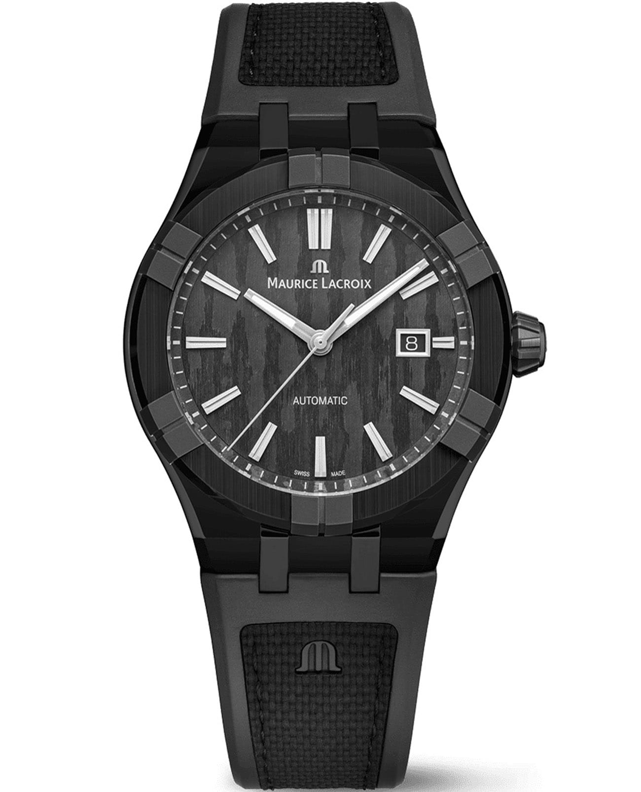 Мужские швейцарские часы Maurice Lacroix Aikon Automatic 43 mm AC6008-TTB00-330-2 с механическим механизмом (автоматический калибр) с высокой точностью. Изысканный циферблат защищен сапфировым стекломСапфировое стеклоПрочный и надёжный материал из кристалла сапфира синтетического происхождения, характеризующийся особой твёрдостью и устойчивостью к царапинам и повреждениям. с антибликовым покрытиемАнтибликовое покрытиеСлой оксида металла в 0,13-0,3 микрон, благодаря которому стекло часов не бликует и не отражает свет. Антибликовое покрытие уменьшает отражение света в 10 раз, обеспечивая отличную читаемость показателей циферблата., устойчивым к царапинам. Эта выразительная модель с корпусом из титана с DLC-покрытиемDLC-покрытиеDiamond like carbon - одно из лучших видов покрытия, представляющее собой углерод с алмазными свойствами. На поверхность материала наносятся распавшиеся молекулы углерода, превращающиеся в плёнку из алмазоподобных связей, которая перенимает твёрдость алмаза. c неподвижным безелемБезельВнешний ободок, закрепляющий стекло. В спортивных часах так называется поворотное кольцо с делениями на циферблате, выполняет роль таймера – замеряет отрезки времени на шкале. Неподвижный безель – элемент декора. Однонаправленно вращающийся безель на дайверских часах позволяет фиксировать моменты погружения и выныривания на поверхность. с керамикой. Стрелки оснащены люминесцентным покрытиемЛюминесцентное покрытиеПозволяет считывать показания времени в темноте. Производители наносят на стрелки, часовые индексы, безель или поверхность циферблата светонакопительный состав, дающий холодное свечение. SuperLumiNova®, обеспечивающим хорошую читаемость в темноте. Водозащита: 100 метров, позволит плавать, нырять. Удобный каучуковый браслет со стандартной застежкой для максимального комфорта и лёгкости в повседневном использовании. Модель подчёркивает индивидуальность владельца и идеально подходит как для повседневного образа.