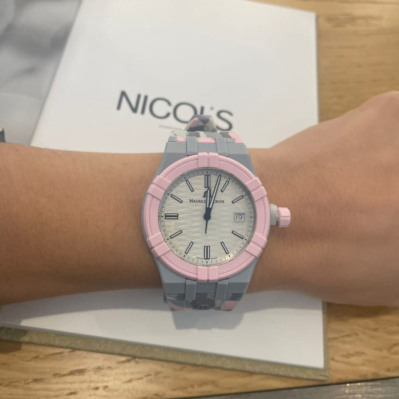 Увековечивая историю #tide, эта новая модель снова изготовлена из переработанного пластика, связанного океаном. Он оснащен черным циферблатом и соответствующим 40-миллиметровым корпусом. БезельБезельВнешний ободок, закрепляющий стекло. В спортивных часах так называется поворотное кольцо с делениями на циферблате, выполняет роль таймера – замеряет отрезки времени на шкале. Неподвижный безель – элемент декора. Однонаправленно вращающийся безель на дайверских часах позволяет фиксировать моменты погружения и выныривания на поверхность. выполнен в розовом цвете, а на камуфляжном силиконовом ремешке красуется логотип Maurice Lacroix в виде буквы "М", также выполненный в камуфляжном оттенке.