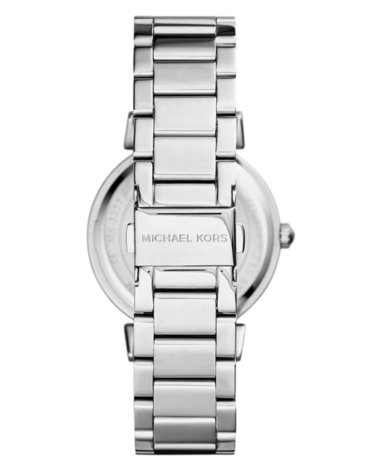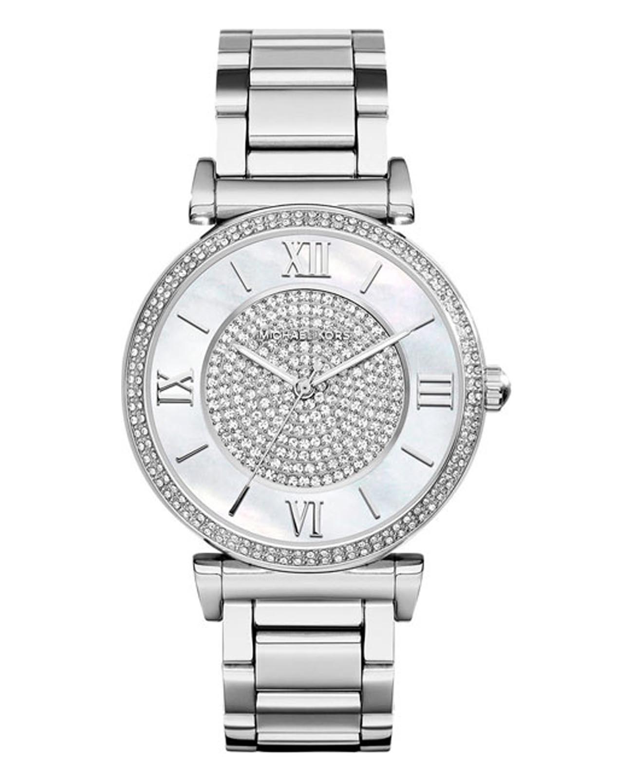Женские американские часы Michael Kors Catlin MK3355, кварцевый механизм с высокой точностью. Минеральное стеклоМинеральное стеклоМинеральное стекло представляет собой искусственно выращенный минерал кварца. Такое стекло отличается особой устойчивостью к повреждениям и царапинам. Уступает по некоторым качествам сапфировому стеклу., устойчивое к мелким механическим повреждениям. Корпус часов выполнен из нержавеющей стали. БезельБезельВнешний ободок, закрепляющий стекло. В спортивных часах так называется поворотное кольцо с делениями на циферблате, выполняет роль таймера – замеряет отрезки времени на шкале. Неподвижный безель – элемент декора. Однонаправленно вращающийся безель на дайверских часах позволяет фиксировать моменты погружения и выныривания на поверхность. и циферблат украшены кристаллами. Класс водозащиты: 30 метров, позволит защитить корпус от случайных брызг или капель дождя. Стальной браслет на раскладной застёжкеРаскладная застёжкаТакой тип застёжки используется только на браслетах из металла. Она никогда не раскрывается полностью, происходит разделение на 2 и более частей. Раскладывающая застёжка снизит вероятность потери часов к минимуму..