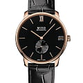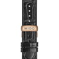 Часы MIDO Baroncelli Mechanical (артикул M037.405.36.050.00) — это лимитированная серия из 2020 экземпляров, сочетающая элегантный дизайн и традиционное часовое мастерство. Корпус диаметром 39 мм выполнен из нержавеющей стали с PVD-покрытиемPVDУльтратонкое покрытие наносится в технике вакуумного напыления, сочетает в себе нитрид титана особой прочности со слоем золота или оксида хрома. Несёт в себе декоративную или защитную функцию. цвета розового золота, водозащитой до 3 бар (30 метров) и прозрачной задней крышкой. Чёрный лакированный циферблат с накладными часовыми метками и римской цифрой «XII» в позиции 12 часов защищён сапфировым стекломСапфировое стеклоПрочный и надёжный материал из кристалла сапфира синтетического происхождения, характеризующийся особой твёрдостью и устойчивостью к царапинам и повреждениям. с двусторонним антибликовым покрытием.