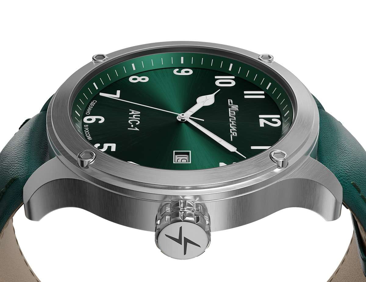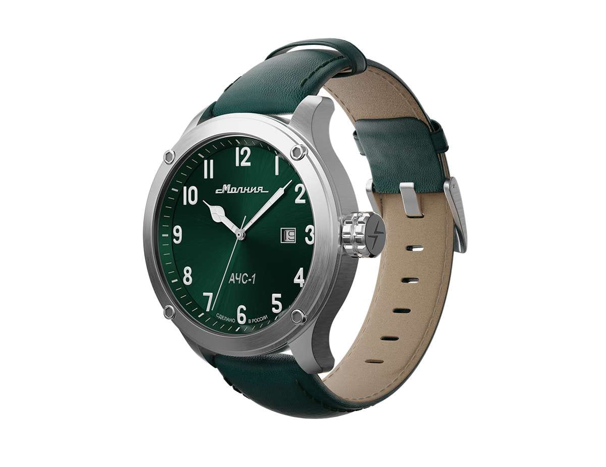 Мужские механические часы с автоподзаводом — это надёжный аксессуар от легендарного бренда «МОЛНИЯ», созданного на Челябинском часовом заводе. Корпус диаметром 44 мм и высотой 12 мм выполнен из нержавеющей стали 316L с матовой полировкой. БезельБезельВнешний ободок, закрепляющий стекло. В спортивных часах так называется поворотное кольцо с делениями на циферблате, выполняет роль таймера – замеряет отрезки времени на шкале. Неподвижный безель – элемент декора. Однонаправленно вращающийся безель на дайверских часах позволяет фиксировать моменты погружения и выныривания на поверхность. также выполнен из стали с матовой отделкой. Циферблат зелёного цвета матовый, оформлен стрелками и индексами с люминесцентным покрытиемЛюминесцентное покрытиеПозволяет считывать показания времени в темноте. Производители наносят на стрелки, часовые индексы, безель или поверхность циферблата светонакопительный состав, дающий холодное свечение. Super-LumiNova. Окошко даты расположено в положении 3 часов. Циферблат защищён сапфировым стекломСапфировое стеклоПрочный и надёжный материал из кристалла сапфира синтетического происхождения, характеризующийся особой твёрдостью и устойчивостью к царапинам и повреждениям. толщиной 1,5 мм. Механизм — японский автоматический калибр Miyota 8215 с функцией и запасом хода 42 часа. Часы оснащены кожаным ремешком зелёного цвета шириной 22 мм с классической пряжкой. Водонепроницаемость 100 м позволяет использовать часы для плавания и повседневного ношения. Идеальный выбор для тех, кто ценит российское качество и мужественный дизайн.