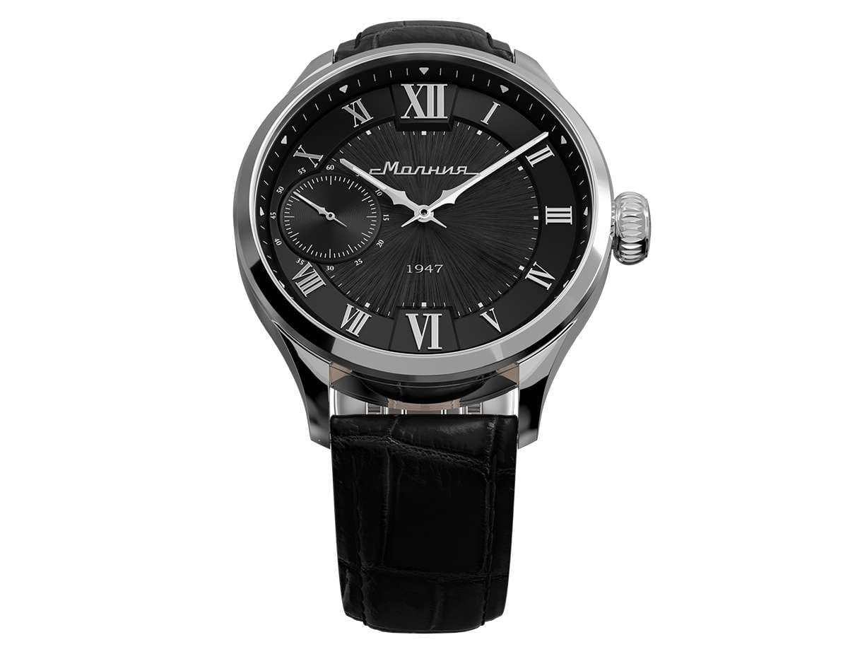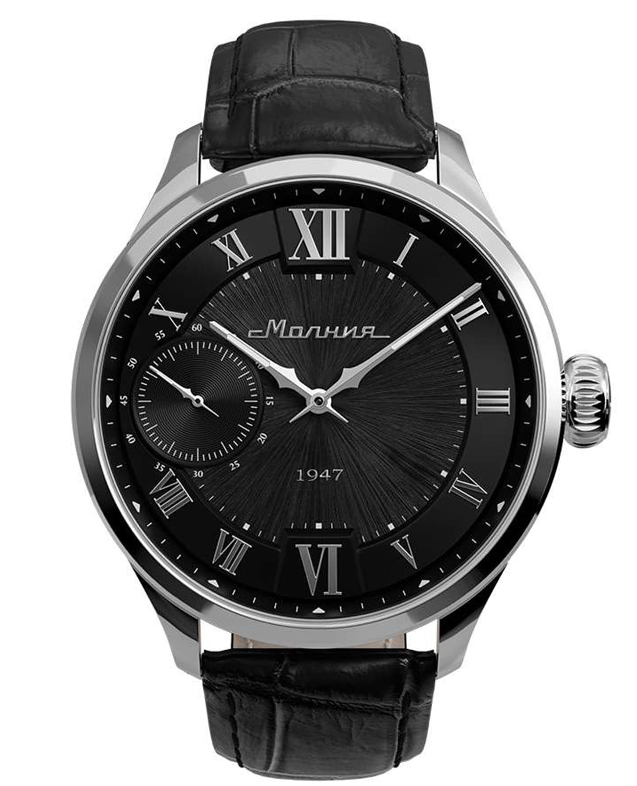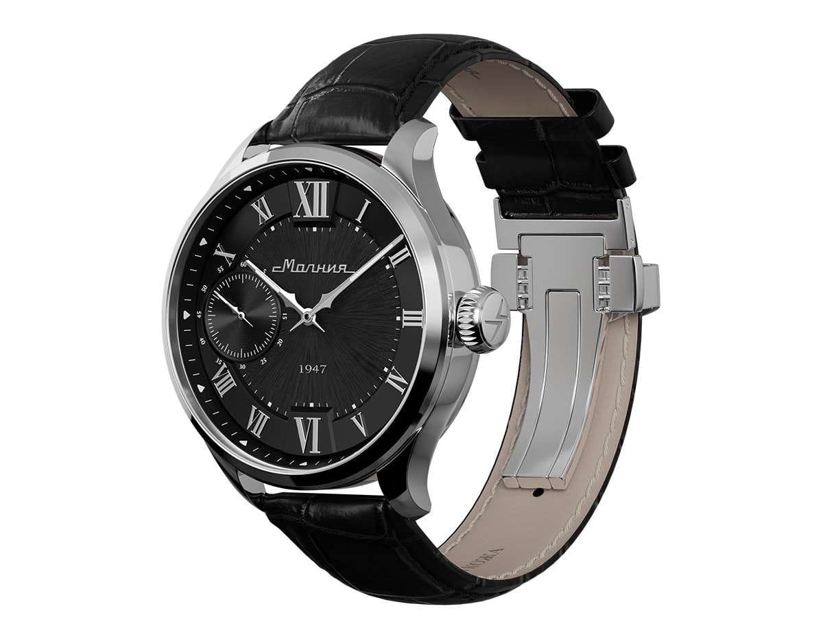 Мужские механические часы с ручным подзаводом — это аксессуар от легендарного бренда «МОЛНИЯ», созданный на Челябинском часовом заводе. Корпус диаметром 41 мм и толщиной 12 мм выполнен из нержавеющей стали 316L с зеркальной полировкой. БезельБезельВнешний ободок, закрепляющий стекло. В спортивных часах так называется поворотное кольцо с делениями на циферблате, выполняет роль таймера – замеряет отрезки времени на шкале. Неподвижный безель – элемент декора. Однонаправленно вращающийся безель на дайверских часах позволяет фиксировать моменты погружения и выныривания на поверхность. также выполнен из стали с зеркальной отделкой. Циферблат чёрного цвета оформлен римскими цифрами и стальными индексами. Малая секундная стрелка вынесена на позицию 9 часов. Циферблат защищён сапфировым стекломСапфировое стеклоПрочный и надёжный материал из кристалла сапфира синтетического происхождения, характеризующийся особой твёрдостью и устойчивостью к царапинам и повреждениям. толщиной 2,5 мм. Механизм — мануфактурный калибр 3603, собранный вручную, с запасом хода до 40 часов. Прозрачная задняя крышка позволяет наблюдать за работой механизма. Часы оснащены чёрным кожаным ремешком шириной 20 мм с раскладной застёжкойРаскладная застёжкаТакой тип застёжки используется только на браслетах из металла. Она никогда не раскрывается полностью, происходит разделение на 2 и более частей. Раскладывающая застёжка снизит вероятность потери часов к минимуму. и системой быстрой замены. Водонепроницаемость 100 м позволяет использовать часы для плавания и повседневного ношения. Идеальный выбор для тех, кто ценит российское качество и традиции.