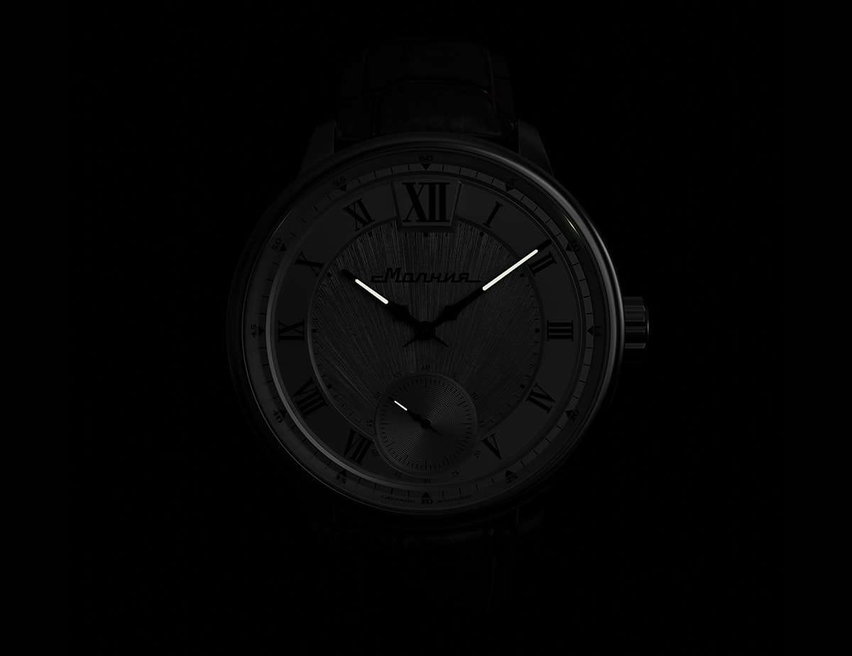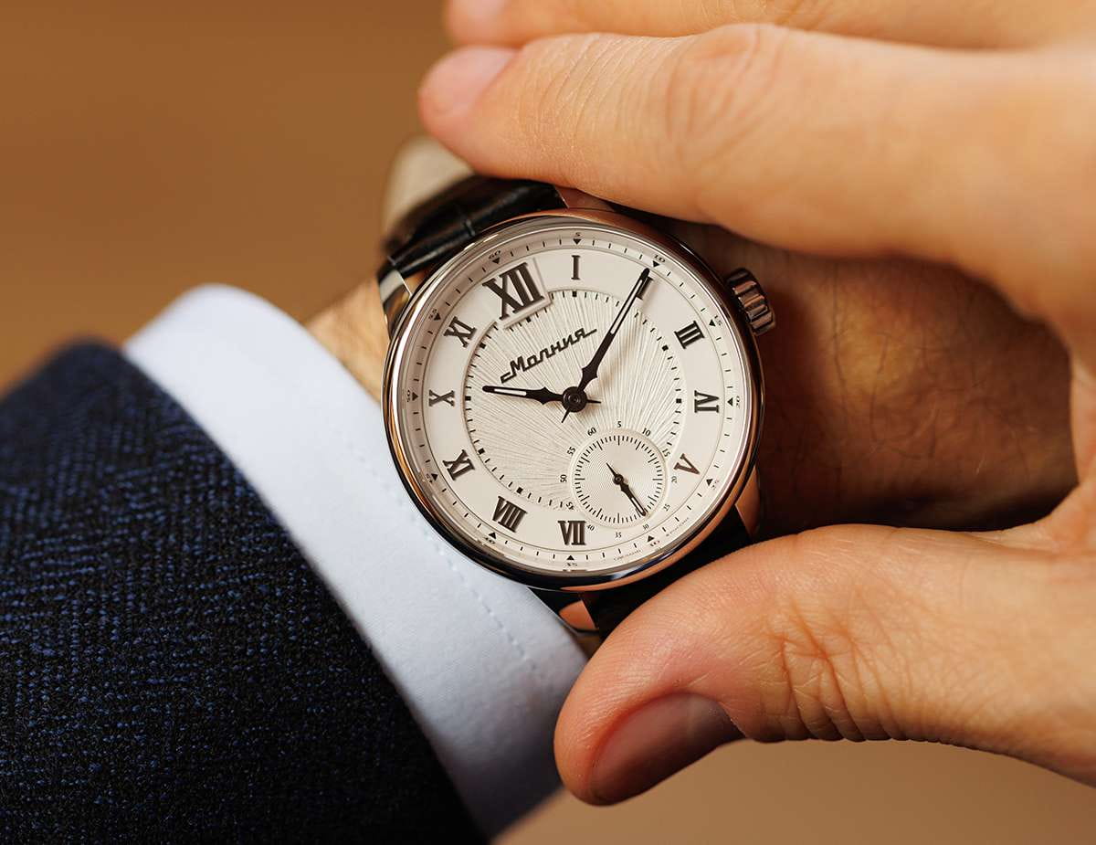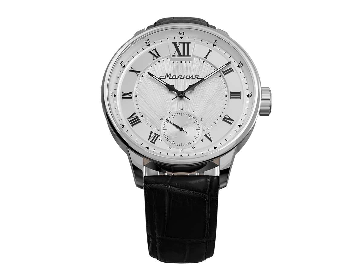 Мужские механические часы с ручным подзаводом — это аксессуар от легендарного бренда «МОЛНИЯ», созданный на Челябинском часовом заводе. Корпус диаметром 41 мм и толщиной 12 мм выполнен из нержавеющей стали 316L с зеркальной полировкой. БезельБезельВнешний ободок, закрепляющий стекло. В спортивных часах так называется поворотное кольцо с делениями на циферблате, выполняет роль таймера – замеряет отрезки времени на шкале. Неподвижный безель – элемент декора. Однонаправленно вращающийся безель на дайверских часах позволяет фиксировать моменты погружения и выныривания на поверхность. также выполнен из стали с зеркальной отделкой. Циферблат белого цвета оформлен римскими цифрами и стальными индексами. Малая секундная стрелка вынесена на позицию 6 часов. Циферблат защищён сапфировым стекломСапфировое стеклоПрочный и надёжный материал из кристалла сапфира синтетического происхождения, характеризующийся особой твёрдостью и устойчивостью к царапинам и повреждениям. толщиной 2,5 мм. Механизм — мануфактурный калибр 3603, собранный вручную, с запасом хода до 40 часов. Прозрачная задняя крышка позволяет наблюдать за работой механизма. Часы оснащены чёрным кожаным ремешком шириной 20 мм с раскладной застёжкойРаскладная застёжкаТакой тип застёжки используется только на браслетах из металла. Она никогда не раскрывается полностью, происходит разделение на 2 и более частей. Раскладывающая застёжка снизит вероятность потери часов к минимуму. и системой быстрой замены. Водонепроницаемость 100 м позволяет использовать часы для плавания и повседневного ношения. Идеальный выбор для тех, кто ценит российское качество и традиции.