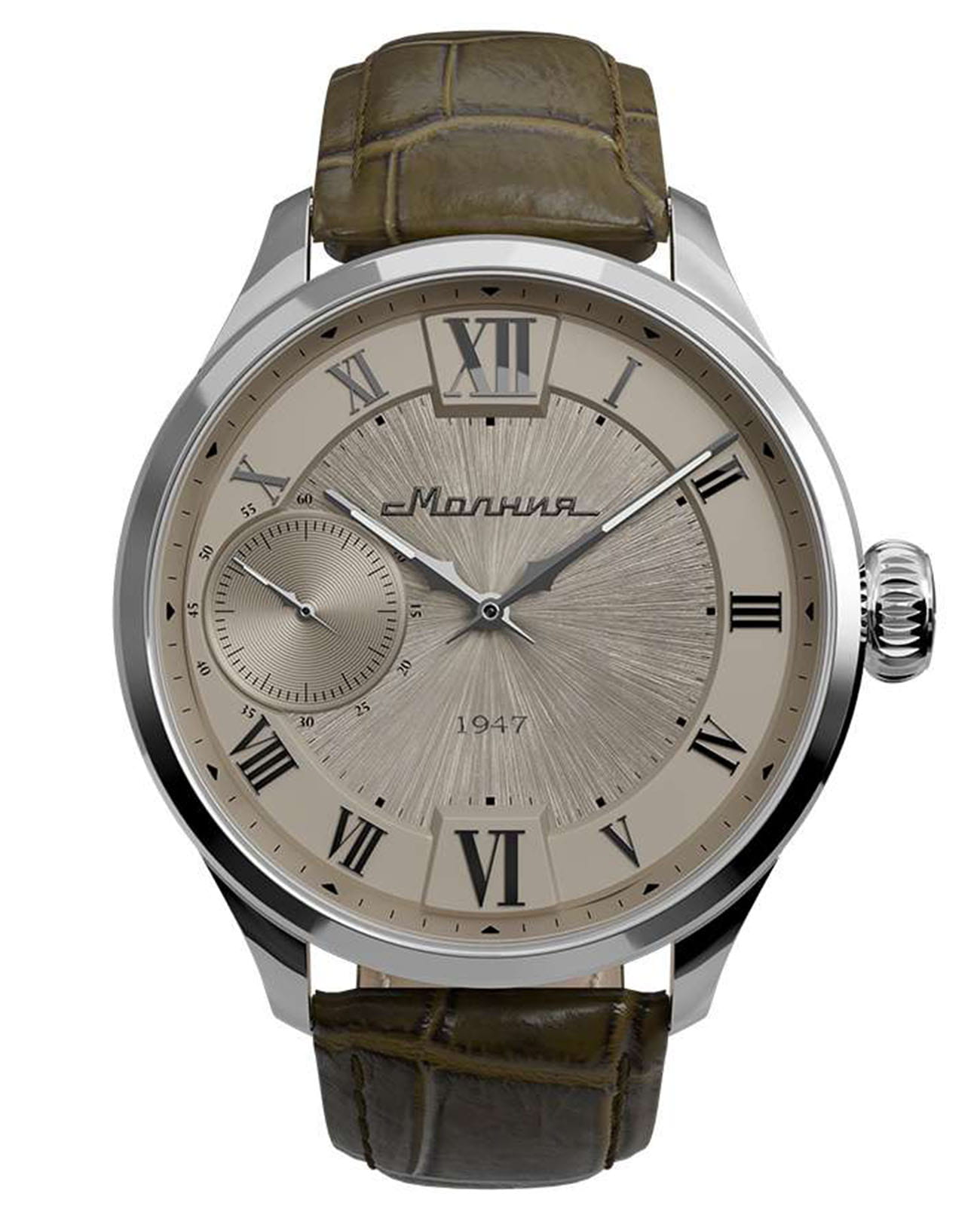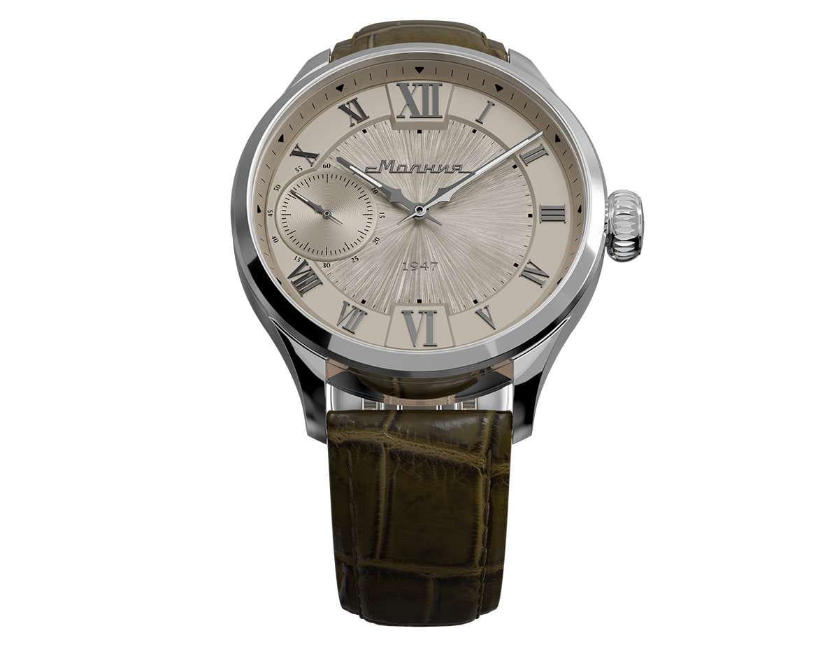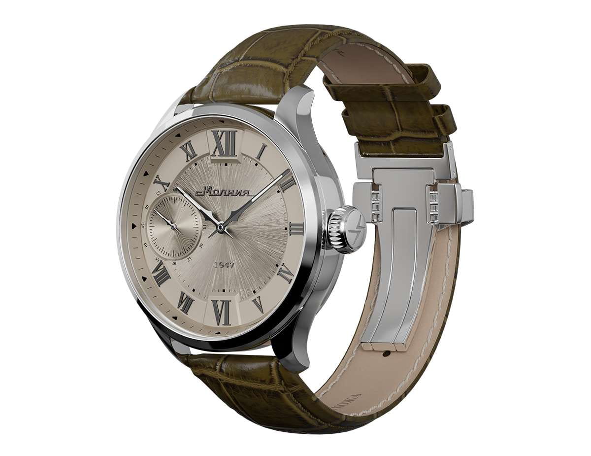 Мужские механические часы с ручным подзаводом — это аксессуар от легендарного бренда «МОЛНИЯ», созданный на Челябинском часовом заводе. Корпус диаметром 41 мм и толщиной 12 мм выполнен из нержавеющей стали 316L с зеркальной полировкой. БезельБезельВнешний ободок, закрепляющий стекло. В спортивных часах так называется поворотное кольцо с делениями на циферблате, выполняет роль таймера – замеряет отрезки времени на шкале. Неподвижный безель – элемент декора. Однонаправленно вращающийся безель на дайверских часах позволяет фиксировать моменты погружения и выныривания на поверхность. также выполнен из стали с зеркальной отделкой. Циферблат бежевый цвета оформлен римскими цифрами и стальными индексами. Малая секундная стрелка вынесена на позицию 9 часов. Циферблат защищён сапфировым стекломСапфировое стеклоПрочный и надёжный материал из кристалла сапфира синтетического происхождения, характеризующийся особой твёрдостью и устойчивостью к царапинам и повреждениям. толщиной 2,5 мм. Механизм — мануфактурный калибр 3603, собранный вручную, с запасом хода до 40 часов. Прозрачная задняя крышка позволяет наблюдать за работой механизма. Часы оснащены коричневым кожаным ремешком шириной 20 мм с раскладной застёжкойРаскладная застёжкаТакой тип застёжки используется только на браслетах из металла. Она никогда не раскрывается полностью, происходит разделение на 2 и более частей. Раскладывающая застёжка снизит вероятность потери часов к минимуму. и системой быстрой замены. Водонепроницаемость 100 м позволяет использовать часы для плавания и повседневного ношения. Идеальный выбор для тех, кто ценит российское качество и традиции.