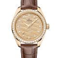 Часы Omega Seamaster Aqua Terra выполнены в симметричном корпусе из полированного 18K Moonshine™ золота с завинчивающейся задней крышкой, украшенной волновым узором. Безель инкрустирован бриллиантами, что добавляет модели роскошный акцент. Циферблат жёлтого цвета дополнен окошком даты и оформлен вручную с использованием техники гильоше, а также 12 бриллиантами по окружности. Стрелки выполнены из 18K Moonshine™ золота и оснащены люминесцентным покрытиемЛюминесцентное покрытиеПозволяет считывать показания времени в темноте. Производители наносят на стрелки, часовые индексы, безель или поверхность циферблата светонакопительный состав, дающий холодное свечение. Super-LumiNova для лучшей читаемости в темноте. Калибр Omega 8807 сертифицирован как Master Chronometer — гарантия высочайшей точности и устойчивости к магнитным полям. Запас хода составляет 55 часов. Защиту циферблата обеспечивает сапфировое стеклоСапфировое стеклоПрочный и надёжный материал из кристалла сапфира синтетического происхождения, характеризующийся особой твёрдостью и устойчивостью к царапинам и повреждениям. с антибликовым покрытиемАнтибликовое покрытиеСлой оксида металла в 0,13-0,3 микрон, благодаря которому стекло часов не бликует и не отражает свет. Антибликовое покрытие уменьшает отражение света в 10 раз, обеспечивая отличную читаемость показателей циферблата. с обеих сторон. Водозащита позволяет использовать часы в воде без риска повреждения. Часы установлены на кожаный ремешок коричневого цвета. Вес модели — около 87 грамм. Это сочетание премиального качества, технологичности и классического дизайна.