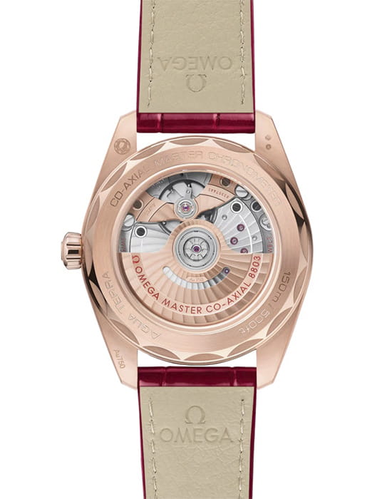 Omega Seamaster Aqua Terra выполнены в симметричном корпусе из 18K Sedna™ золота с волновым узором на задней крышке. Безель украшен бриллиантами, а циферблат дополнен окошком даты на 6 часах и малым секундным циферблатом с кольцом из 18К Sedna™ золота, инкрустированным бриллиантами. Стрелки и метки оснащены люминесцентным покрытиемЛюминесцентное покрытиеПозволяет считывать показания времени в темноте. Производители наносят на стрелки, часовые индексы, безель или поверхность циферблата светонакопительный состав, дающий холодное свечение. для лучшей читаемости в темноте. Индексы выполнены в виде бриллиантов, установленных в держатели из 18К Sedna™ золота. Калибр Omega 8803 сертифицирован как Master Chronometer — гарантия высочайшей точности и устойчивости к магнитным полям. Запас хода составляет 55 часов. Защиту циферблата обеспечивает сапфировое стеклоСапфировое стеклоПрочный и надёжный материал из кристалла сапфира синтетического происхождения, характеризующийся особой твёрдостью и устойчивостью к царапинам и повреждениям. с антибликовым покрытиемАнтибликовое покрытиеСлой оксида металла в 0,13-0,3 микрон, благодаря которому стекло часов не бликует и не отражает свет. Антибликовое покрытие уменьшает отражение света в 10 раз, обеспечивая отличную читаемость показателей циферблата. с обеих сторон. Водозащита позволяет использовать часы в воде без риска повреждения. Диаметр корпуса — 38 мм, между "ушками" — 19 мм, толщина — 12.7 мм. Часы установлены на кожаный ремешок. Вес модели — около 111 грамм. Это сочетание премиального качества, технологичности и классического дизайна.