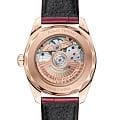 Omega Seamaster Aqua Terra выполнены в симметричном корпусе из 18K Sedna™ золота с завинчивающейся задней крышкой, украшенной волновым узором. Безель инкрустирован бриллиантами, что добавляет модели роскошный акцент. Циферблат дополнен окошком даты и оформлен уникальным волновым рисунком, созданным методом wire bonding — технологией, используемой в микроэлектронике. Циферблат имеет основу из 18K золота и покрыт PVD для стойкости цвета. Часовые метки представлены рубинами, а стрелки выполнены из 18K Sedna™ золота и оснащены люминесцентным покрытиемЛюминесцентное покрытиеПозволяет считывать показания времени в темноте. Производители наносят на стрелки, часовые индексы, безель или поверхность циферблата светонакопительный состав, дающий холодное свечение. Super-LumiNova для лучшей читаемости в темноте. Калибр Omega 8807 сертифицирован как Master Chronometer — гарантия высочайшей точности и устойчивости к магнитным полям. Запас хода составляет 55 часов. Защиту циферблата обеспечивает сапфировое стеклоСапфировое стеклоПрочный и надёжный материал из кристалла сапфира синтетического происхождения, характеризующийся особой твёрдостью и устойчивостью к царапинам и повреждениям. с антибликовым покрытиемАнтибликовое покрытиеСлой оксида металла в 0,13-0,3 микрон, благодаря которому стекло часов не бликует и не отражает свет. Антибликовое покрытие уменьшает отражение света в 10 раз, обеспечивая отличную читаемость показателей циферблата. с обеих сторон. Водозащита позволяет использовать часы в воде без риска повреждения. Часы установлены на красный кожаный ремешок. Это сочетание премиального качества, технологичности и классического дизайна.