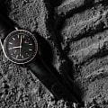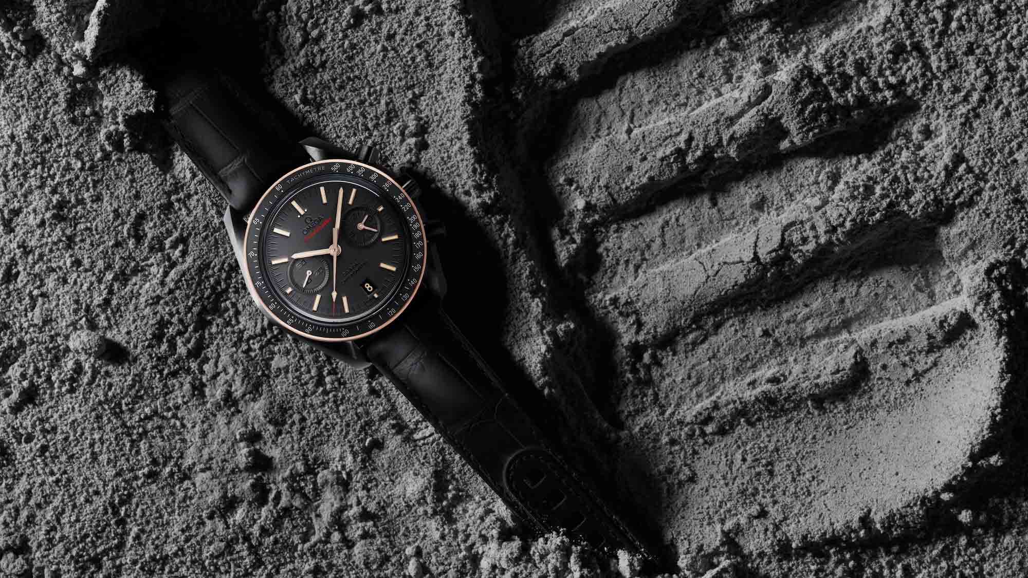 , повторяющимся в стрелках и накладных индексах. Матовый серый циферблат с лазерной разметкой дополнен чёрным кожаным ремешком и матовой керамической раскладывающейся застёжкой. В основе - коаксиальный механизм OMEGA калибра 9300, сочетающий инновации с космическим наследием бренда.