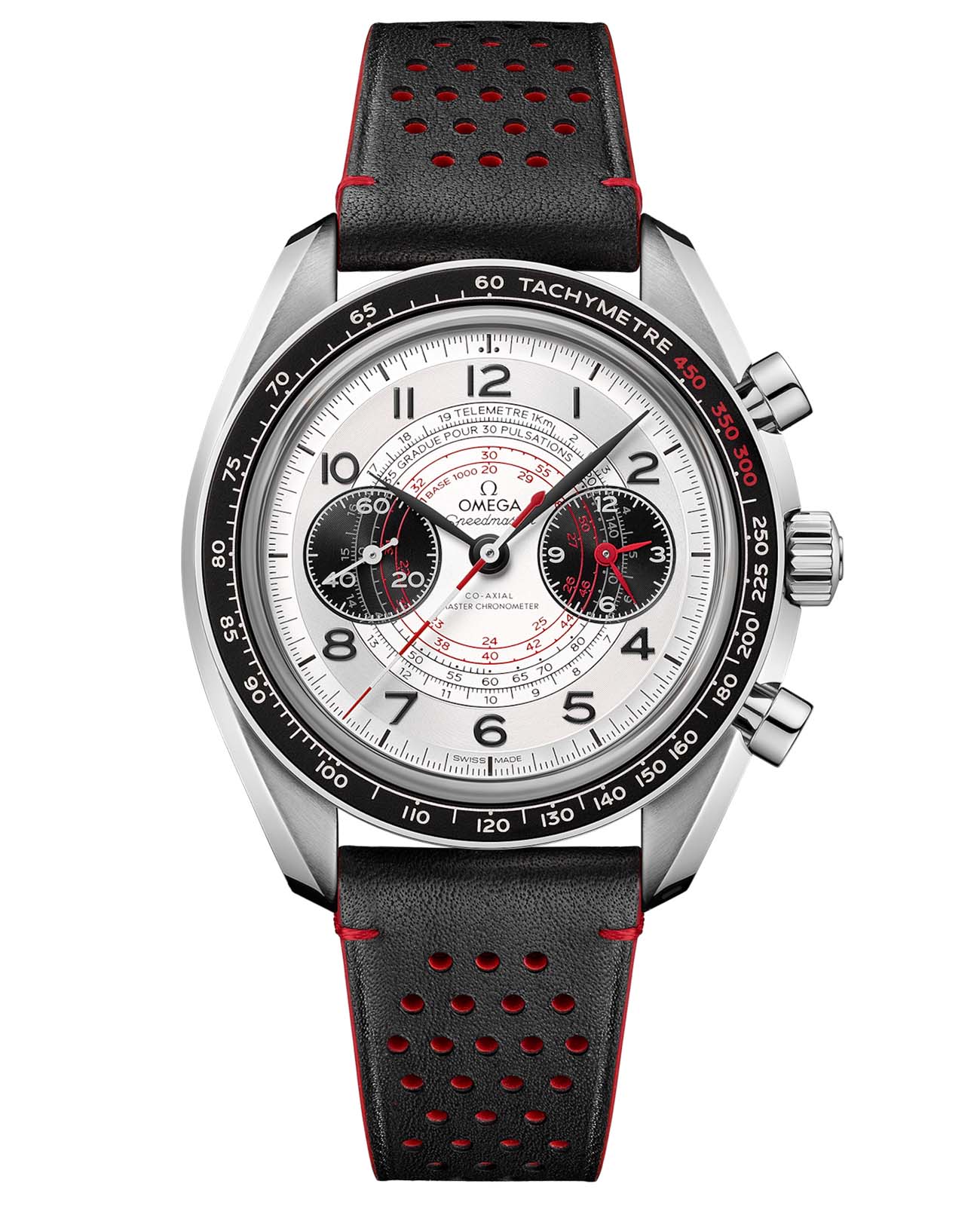 Chronoscope мастерски объединяет наследие винтажных хронографов OMEGA 1940-х с узнаваемой эстетикой Speedmaster. 43-мм корпус из нержавеющей стали с черным безелемБезельВнешний ободок, закрепляющий стекло. В спортивных часах так называется поворотное кольцо с делениями на циферблате, выполняет роль таймера – замеряет отрезки времени на шкале. Неподвижный безель – элемент декора. Однонаправленно вращающийся безель на дайверских часах позволяет фиксировать моменты погружения и выныривания на поверхность. из анодированного алюминия обрамляет серебристый циферблат, украшенный чернеными элементами и спиралевидным узором. Три исторические шкалы в форме улитки - тахиметрическаяТахиметрРазмеченная шкала, располагается на ободке или безеле часов. Тахиметр позволяет рассчитать скорость на определённом участке пути, расстояние измеряется в километрах или милях., пульсометрическая и телеметрическая - создают уникальный измерительный комплекс. Черненые стрелки в форме листьев и арабские цифры подчеркивают ретро-стиль. На позиции "9 часов" расположен счетчик малых секунд, а на "3 часах" - "60-минутный и 12-часовой счетчики" с контрастными красными стрелками. Часы дополнены черным перфорированным кожаным ремешком с эффектной красной подкладкой, а калибр OMEGA Co-Axial Master Chronometer 9908 гарантирует безупречную точность, соединяя традиции с современными технологиями.
