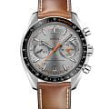 Speedmaster Racing Master Chronometer в 44,25-мм корпусе из нержавеющей стали с коричневым кожаным ремешком представляет собой гармоничное сочетание автоспортивной эстетики и часового искусства. Черное керамическое кольцоБезельВнешний ободок, закрепляющий стекло. В спортивных часах так называется поворотное кольцо с делениями на циферблате, выполняет роль таймера – замеряет отрезки времени на шкале. Неподвижный безель – элемент декора. Однонаправленно вращающийся безель на дайверских часах позволяет фиксировать моменты погружения и выныривания на поверхность. с тахиметрической шкалойТахиметрРазмеченная шкала, располагается на ободке или безеле часов. Тахиметр позволяет рассчитать скорость на определённом участке пути, расстояние измеряется в километрах или милях. эффектно сочетает оранжевые надписи с высокотехнологичными цифрами из Liquidmetal™. Серый циферблат с радиальным сатинированием и характерной "спидометрной" минутной шкалой дополнен двумя счетчиками с родиевыми кольцами и окошком даты на 6 часах. Черненые и оранжевые стрелки создают выразительный контраст с чернеными индексами в форме стрел, покрытыми Super-LumiNovaЛюминесцентное покрытиеПозволяет считывать показания времени в темноте. Производители наносят на стрелки, часовые индексы, безель или поверхность циферблата светонакопительный состав, дающий холодное свечение.. В основе часов - прецизионный калибр OMEGA Co-Axial Master Chronometer 9900, сертифицированный институтом METAS, что гарантирует безупречную точность и надежность.