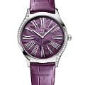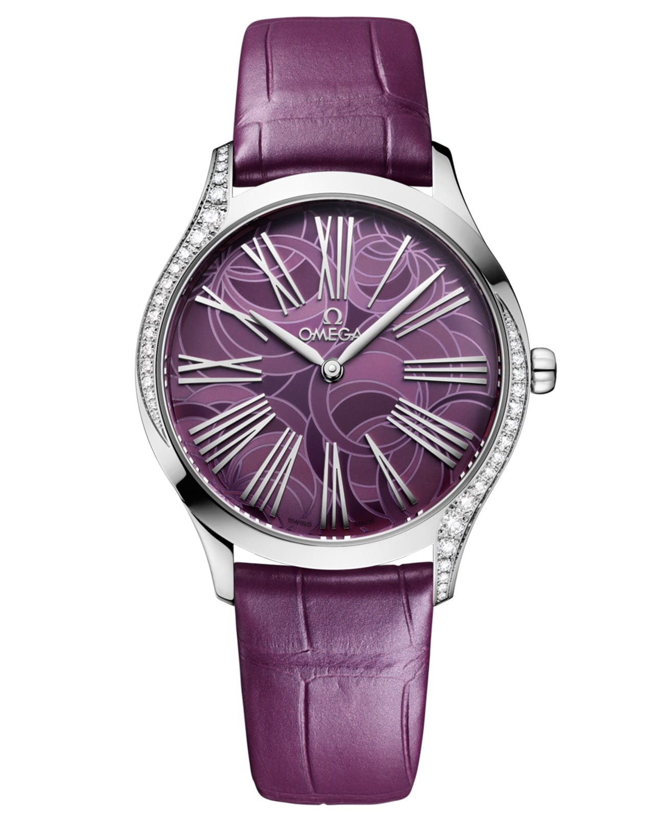 OMEGA Trésor с цветочным очарованием — это гармония роскоши и природной грации. 36-мм корпус из полированной стали, усыпанный 38 бриллиантами (0,49 карата), напоминает утреннюю росу на лепестках. Под сапфировым стекломСапфировое стеклоПрочный и надёжный материал из кристалла сапфира синтетического происхождения, характеризующийся особой твёрдостью и устойчивостью к царапинам и повреждениям. раскрывается циферблат с пурпурным PVD-покрытиемPVDУльтратонкое покрытие наносится в технике вакуумного напыления, сочетает в себе нитрид титана особой прочности со слоем золота или оксида хрома. Несёт в себе декоративную или защитную функцию., украшенный изящным лазерным узором пиона — символа процветания. Заводная головка с бриллиантом и родиевые элементы придают благородный блеск. Пурпурный кожаный ремешок с металлической застежкой завершает образ, а зеркальная крышка с узором "Her Time" скрывает точный механизм OMEGA 4061.