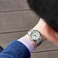Часы укомплектованы стальным браслетом с раскладной застежкойРаскладная застёжкаТакой тип застёжки используется только на браслетах из металла. Она никогда не раскрывается полностью, происходит разделение на 2 и более частей. Раскладывающая застёжка снизит вероятность потери часов к минимуму., которая обеспечивает удобную и надежную фиксацию на запястье.