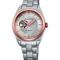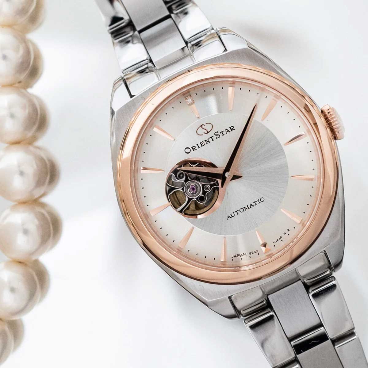 Женские механические часы с автоподзаводом Orient Star — изящный скелетон в японском исполнении. Корпус из нержавеющей стали. БезельБезельВнешний ободок, закрепляющий стекло. В спортивных часах так называется поворотное кольцо с делениями на циферблате, выполняет роль таймера – замеряет отрезки времени на шкале. Неподвижный безель – элемент декора. Однонаправленно вращающийся безель на дайверских часах позволяет фиксировать моменты погружения и выныривания на поверхность. из нержавеющей стали с IP-покрытиемIP-покрытиеМетод ионного напыления. Демонстрирует повышенную устойчивость к истиранию, окислению и химическим веществам. Под воздействием высокого давления и температуры около 1500°C молекулы металла надёжно соединяются с частицами корпуса часов. цвета розового золота, диаметром 30 мм. Циферблат — серебристый, с текстурой Sunray, штриховыми метками и кристаллом на отметке 12; сквозь прозрачное окошко виден баланс механизма. Стекло — сапфировоеСапфировое стеклоПрочный и надёжный материал из кристалла сапфира синтетического происхождения, характеризующийся особой твёрдостью и устойчивостью к царапинам и повреждениям. с антибликовым покрытием. Браслет — стальной 316L на раскладной застёжкеРаскладная застёжкаТакой тип застёжки используется только на браслетах из металла. Она никогда не раскрывается полностью, происходит разделение на 2 и более частей. Раскладывающая застёжка снизит вероятность потери часов к минимуму.. Водонепроницаемость 50 м. Идеальный выбор для тех, кто ценит японское качество и утончённый дизайн.