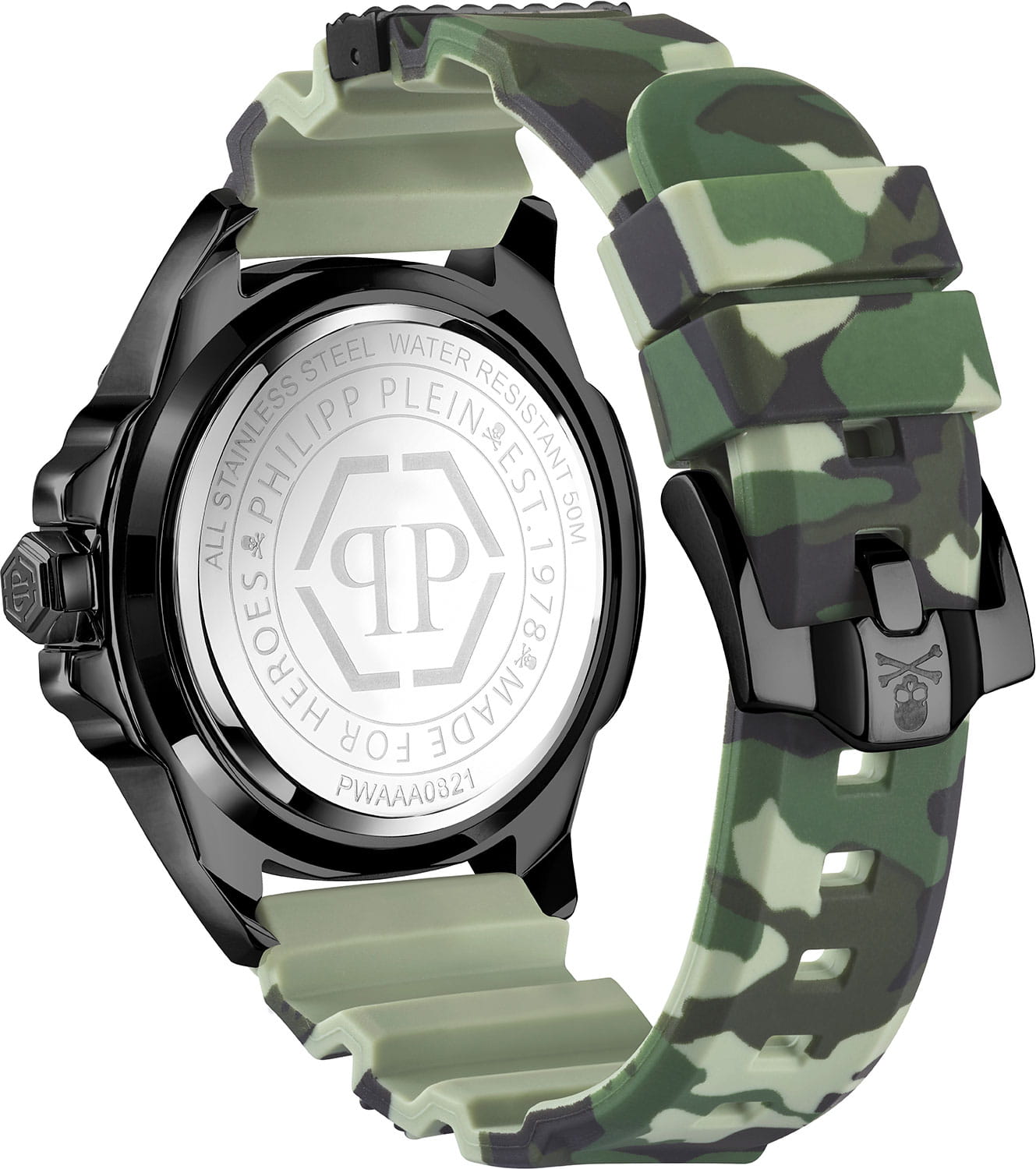 Яркие мужские часы Philipp Plein The Skull PWAAA0821, кварцевый механизм с высокой точностью. Класс водозащиты: 50 метров, позволит защитить корпус от случайных брызг или капель дождя. Корпус часов изготовлен из стали, цвета.