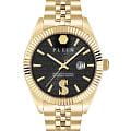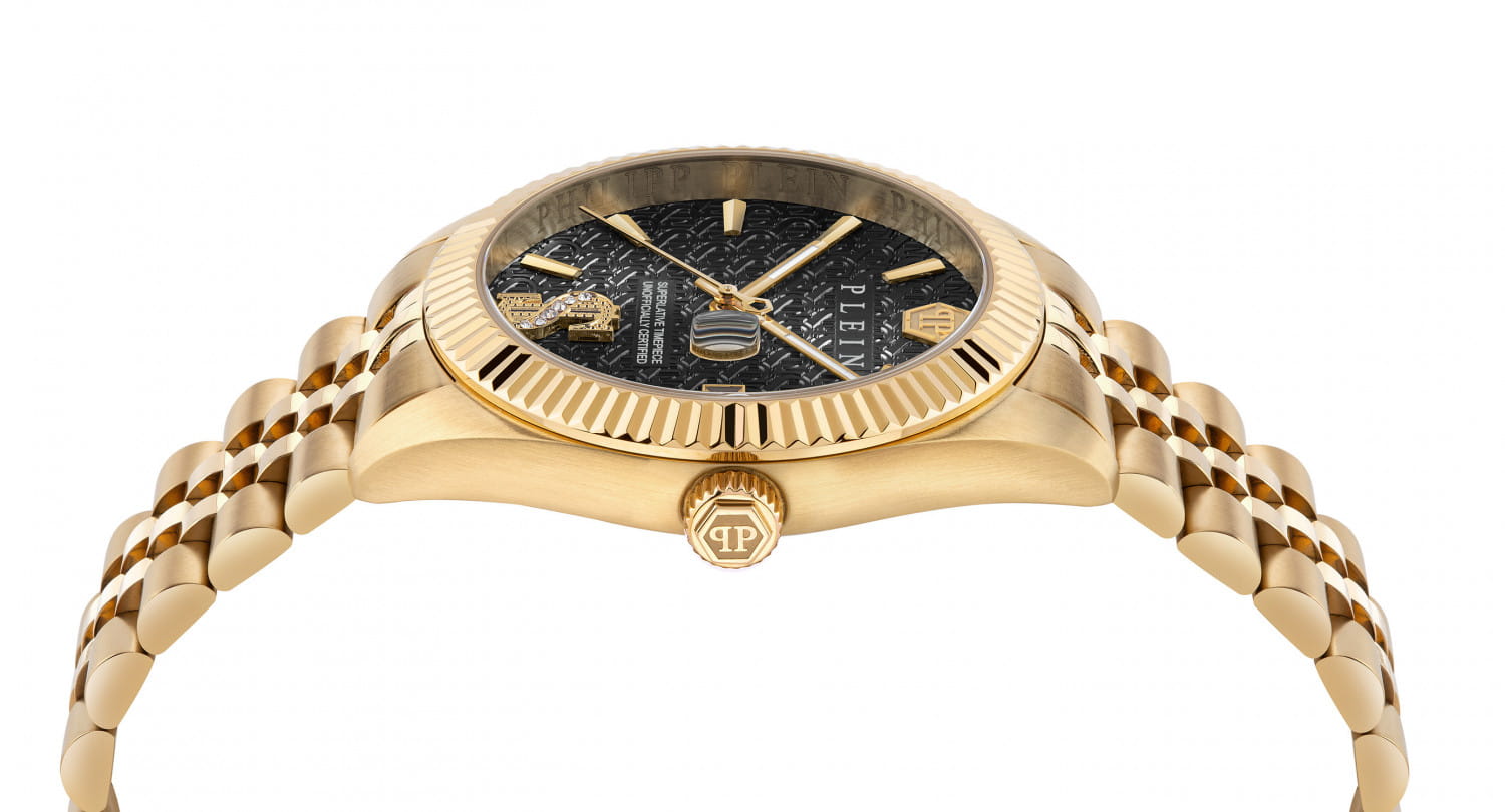 Philipp Plein Date Superlative PWMFA1025 - часы в современном дизайне несомненно добавят вам выразительности и станут главным акцентом вашего стильного образа. Мужские кварцевые часы с высокой точностью. Круглый стальной корпус с PVD-покрытиемPVDУльтратонкое покрытие наносится в технике вакуумного напыления, сочетает в себе нитрид титана особой прочности со слоем золота или оксида хрома. Несёт в себе декоративную или защитную функцию. золотистого цвета, диаметром 41 мм. Циферблат декорирован логотипом бренда в положении 12 часов, метки в виде штрихов. Минеральное стеклоМинеральное стеклоМинеральное стекло представляет собой искусственно выращенный минерал кварца. Такое стекло отличается особой устойчивостью к повреждениям и царапинам. Уступает по некоторым качествам сапфировому стеклу. защищает циферблат от царапин. Люминесцентное покрытиеЛюминесцентное покрытиеПозволяет считывать показания времени в темноте. Производители наносят на стрелки, часовые индексы, безель или поверхность циферблата светонакопительный состав, дающий холодное свечение. стрелок позволит следить за временем даже в полной темноте. Окошко даты находится в положении 3 часа. Стальной браслет с PVD-покрытиемPVDУльтратонкое покрытие наносится в технике вакуумного напыления, сочетает в себе нитрид титана особой прочности со слоем золота или оксида хрома. Несёт в себе декоративную или защитную функцию. на застёжке-бабочке с кнопкамиЗастёжка "бабочка"Такой вид застёжки дополняется предохранителями, помогающими избежать случайного раскрытия браслета. Обладают изящным исполнением. , обеспечивает комфортное ношение. Граненая заводная головка. Влагозащита: 50 метров, позволит защитить корпус от случайных брызг или капель дождя. Идеальный аксессуар для тех, кто ценит индивидуальность и не боится выделяться из толпы.