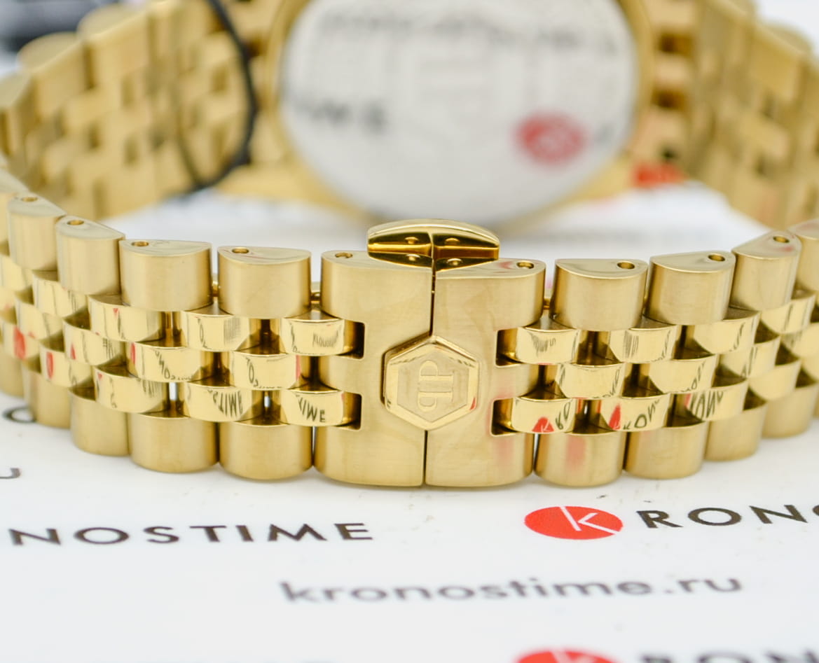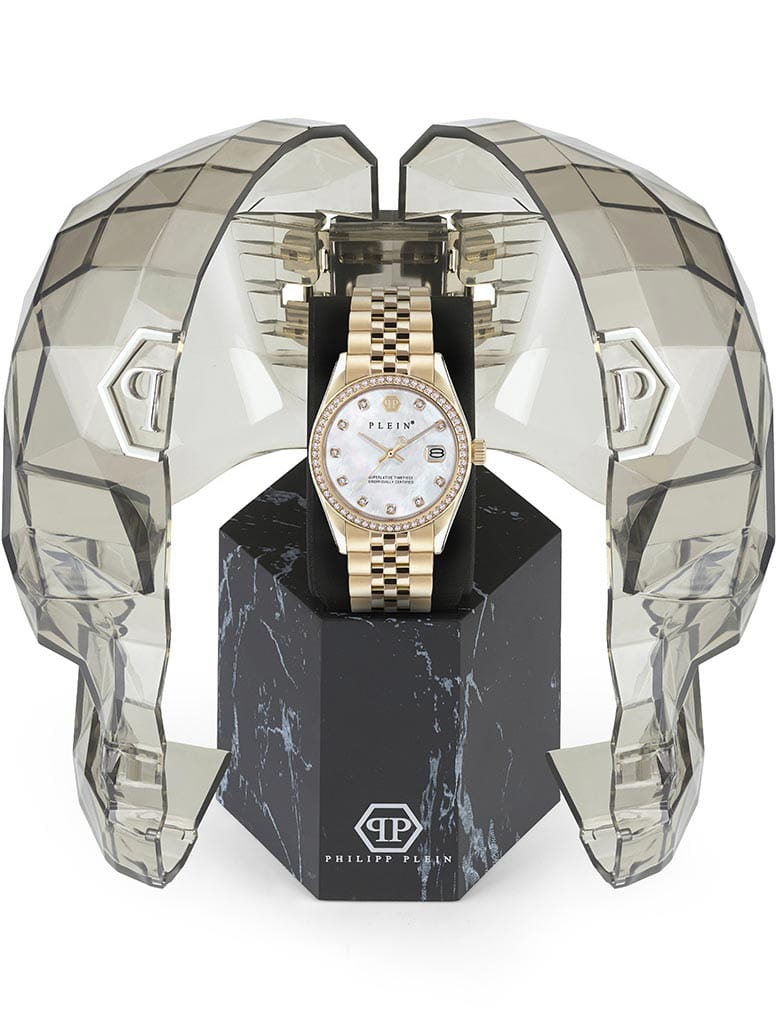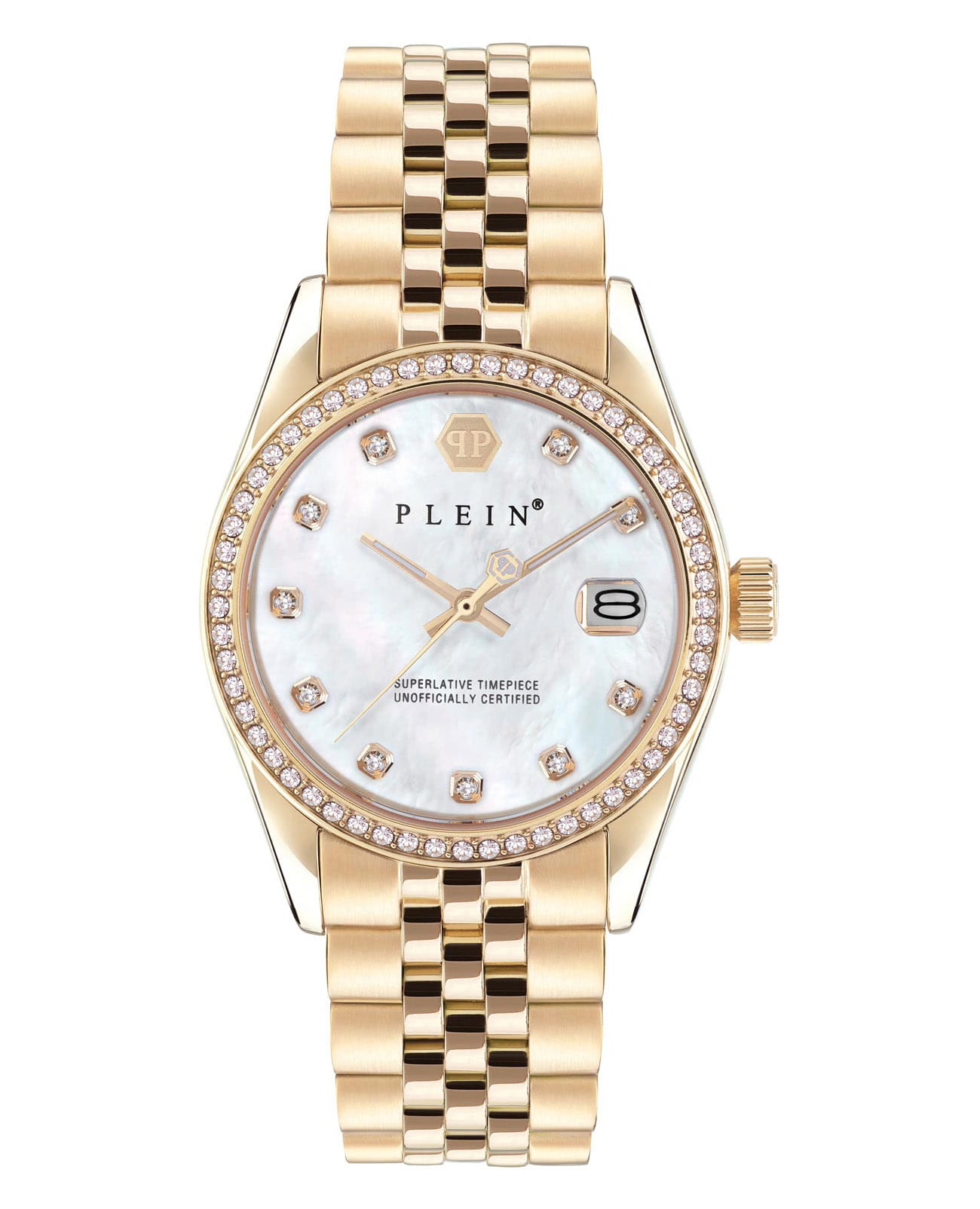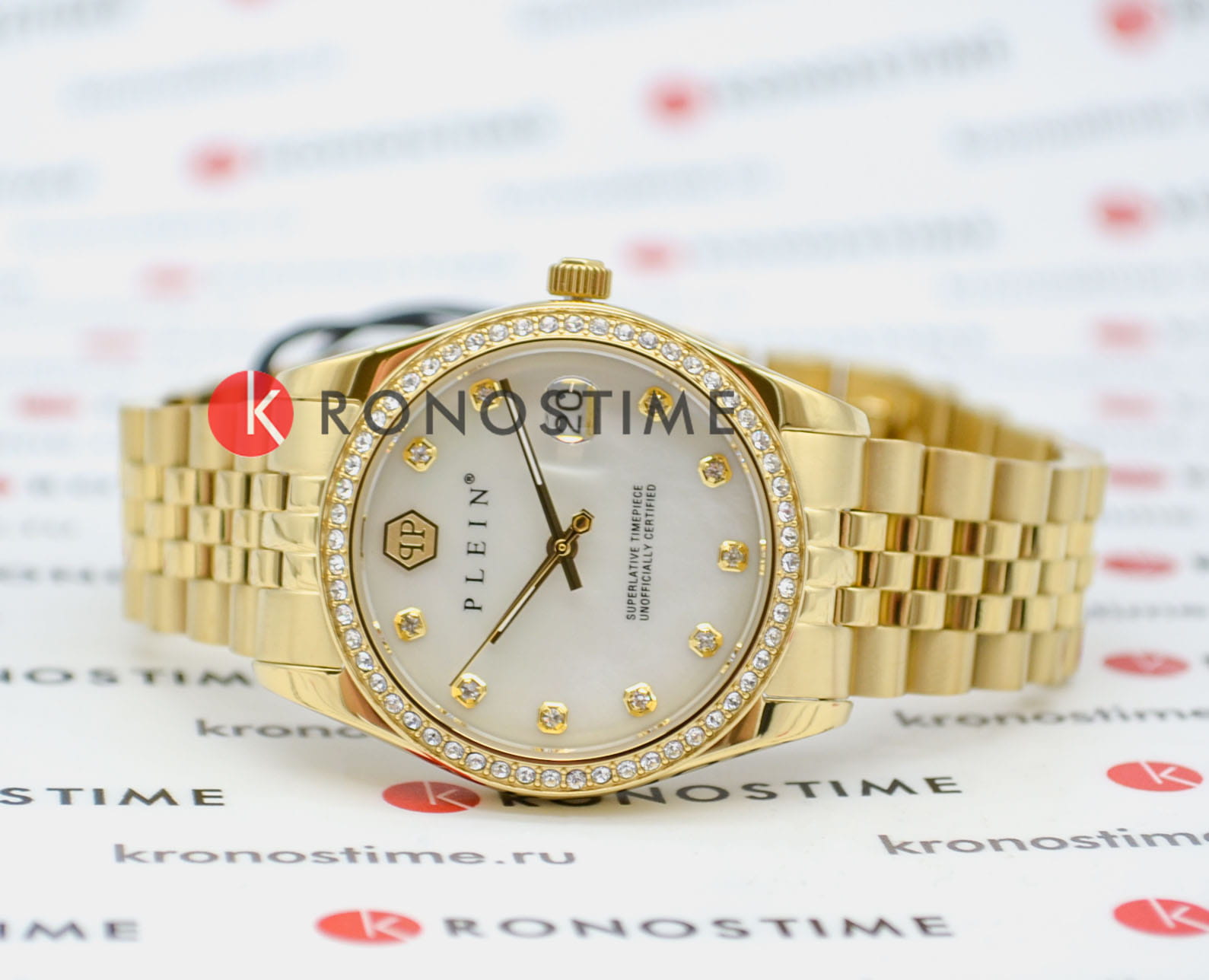 Яркие женские часы Philipp Plein Date Superlative PWYAA0323 с минеральным стекломМинеральное стеклоМинеральное стекло представляет собой искусственно выращенный минерал кварца. Такое стекло отличается особой устойчивостью к повреждениям и царапинам. Уступает по некоторым качествам сапфировому стеклу.. Особенные часы для особенных женщин! Ослепительный аксессуар, демонстрирующий роскошь и изысканность.Часы с круглым стальным корпусом с IP-покрытиемIP-покрытиеМетод ионного напыления. Демонстрирует повышенную устойчивость к истиранию, окислению и химическим веществам. Под воздействием высокого давления и температуры около 1500°C молекулы металла надёжно соединяются с частицами корпуса часов.. Перламутровый циферблат с метками в виде точек, украшенных кристаллами. Люминесцентное покрытиеЛюминесцентное покрытиеПозволяет считывать показания времени в темноте. Производители наносят на стрелки, часовые индексы, безель или поверхность циферблата светонакопительный состав, дающий холодное свечение. стрелок. Окошко даты с увеличительным стеклом находится в положении 3 часа. Рифленая заводная головка. Стальной браслет на застёжке бабочка с кнопкамиЗастёжка "бабочка"Такой вид застёжки дополняется предохранителями, помогающими избежать случайного раскрытия браслета. Обладают изящным исполнением.