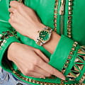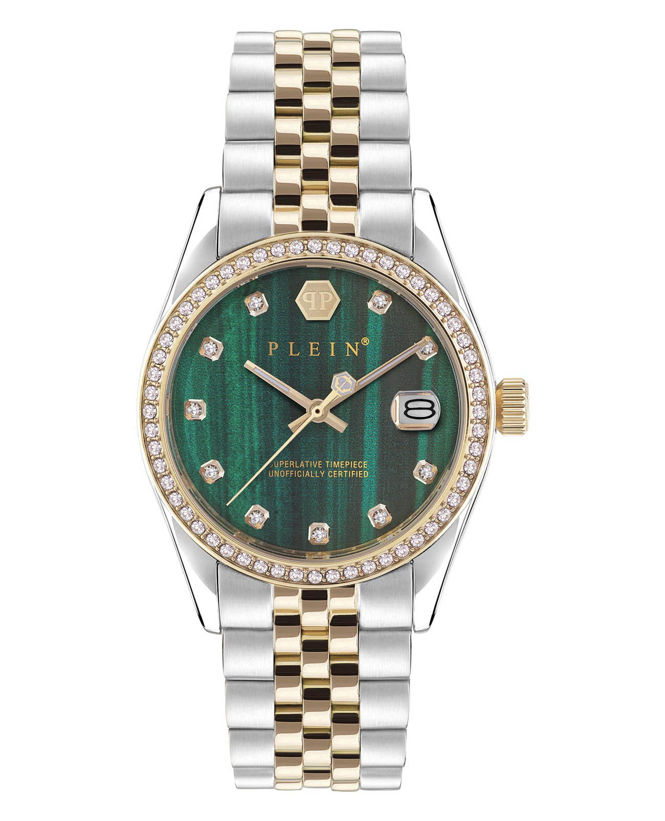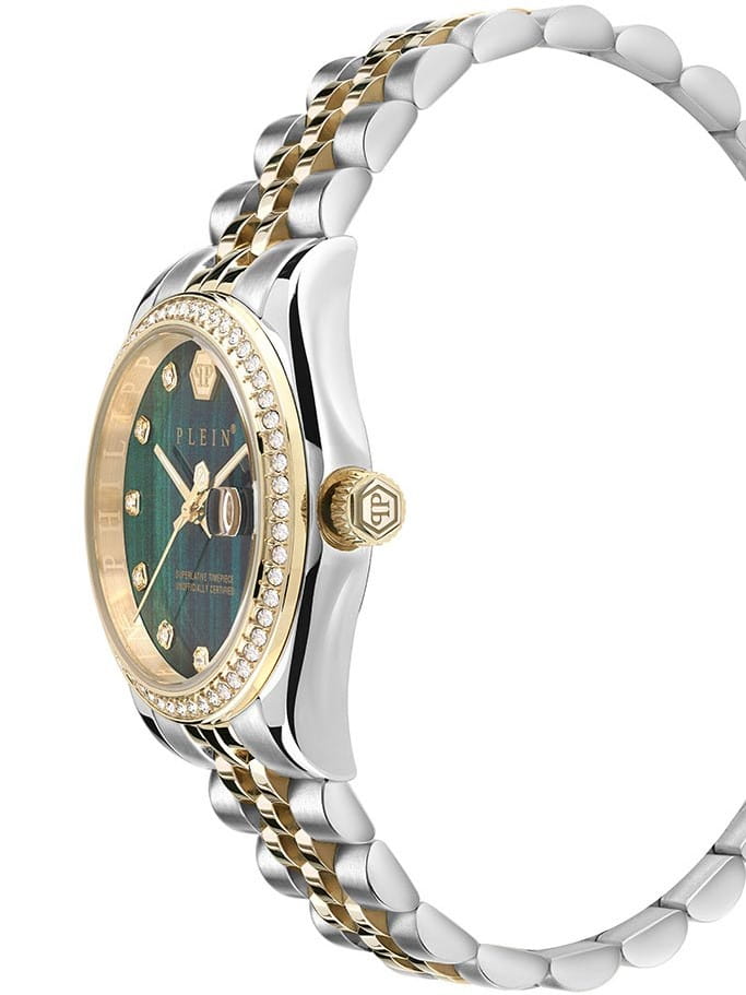Яркие женские часы  Philipp Plein Date Superlative PWYAA0523 c с минеральным стекломМинеральное стеклоМинеральное стекло представляет собой искусственно выращенный минерал кварца. Такое стекло отличается особой устойчивостью к повреждениям и царапинам. Уступает по некоторым качествам сапфировому стеклу.. Особенные часы для особенных женщин! Ослепительный аксессуар, демонстрирующий роскошь и изысканность.Часы с круглым стальным корпусом с IP-покрытиемIP-покрытиеМетод ионного напыления. Демонстрирует повышенную устойчивость к истиранию, окислению и химическим веществам. Под воздействием высокого давления и температуры около 1500°C молекулы металла надёжно соединяются с частицами корпуса часов.. Перламутровый циферблат с метками в виде точек, украшенных кристаллами. Люминесцентное покрытиеЛюминесцентное покрытиеПозволяет считывать показания времени в темноте. Производители наносят на стрелки, часовые индексы, безель или поверхность циферблата светонакопительный состав, дающий холодное свечение. стрелок. Окошко даты с увеличительным стеклом находится в положении 3 часа. Рифленая заводная головка. Стальной браслет на застёжке бабочка с кнопкамиЗастёжка "бабочка"Такой вид застёжки дополняется предохранителями, помогающими избежать случайного раскрытия браслета. Обладают изящным исполнением.