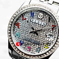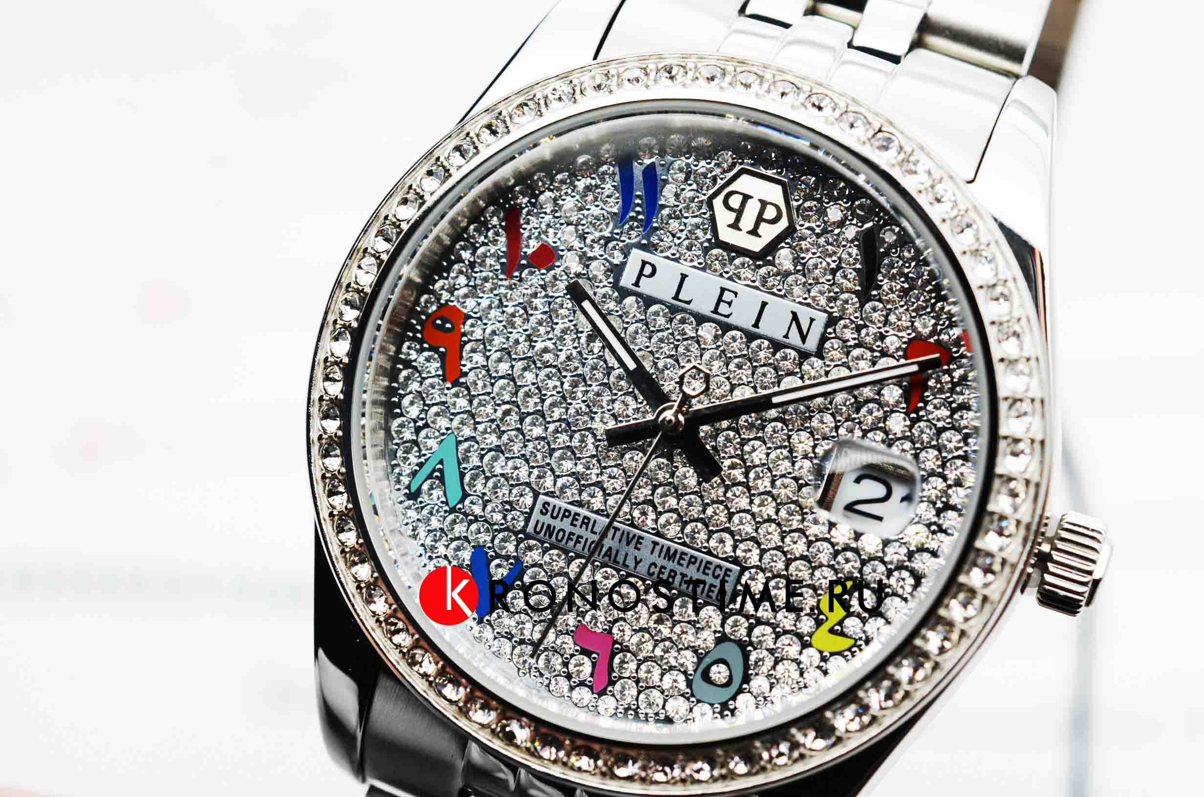 Яркие женские часы Philipp Plein Date Superlative PWYAA0723 c с минеральным стекломМинеральное стеклоМинеральное стекло представляет собой искусственно выращенный минерал кварца. Такое стекло отличается особой устойчивостью к повреждениям и царапинам. Уступает по некоторым качествам сапфировому стеклу.. Особенные часы для особенных женщин! Ослепительный аксессуар, демонстрирующий роскошь и изысканность.Часы с круглым стальным корпусом. Перламутровый циферблат с метками в виде точек, украшенных кристаллами. Люминесцентное покрытиеЛюминесцентное покрытиеПозволяет считывать показания времени в темноте. Производители наносят на стрелки, часовые индексы, безель или поверхность циферблата светонакопительный состав, дающий холодное свечение. стрелок. Окошко даты с увеличительным стеклом находится в положении 3 часа. Рифленая заводная головка. Стальной браслет на застёжке бабочка с кнопкамиЗастёжка "бабочка"Такой вид застёжки дополняется предохранителями, помогающими избежать случайного раскрытия браслета. Обладают изящным исполнением.