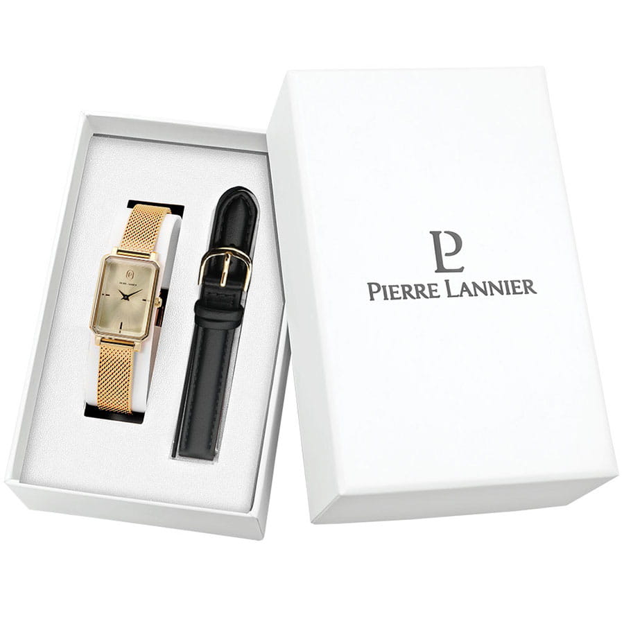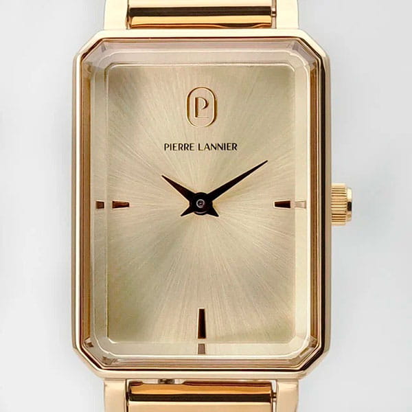 Женские кварцевые часы Pierre Lannier — это элегантный аксессуар с французским дизайном. Корпус прямоугольной формы размером 21 мм и толщиной 7,8 мм выполнен из нержавеющей стали с IP-покрытиемIP-покрытиеМетод ионного напыления. Демонстрирует повышенную устойчивость к истиранию, окислению и химическим веществам. Под воздействием высокого давления и температуры около 1500°C молекулы металла надёжно соединяются с частицами корпуса часов. цвета жёлтого золота. Циферблат золотистого цвета оформлен стрелками. Циферблат защищён минеральным стекломМинеральное стеклоМинеральное стекло представляет собой искусственно выращенный минерал кварца. Такое стекло отличается особой устойчивостью к повреждениям и царапинам. Уступает по некоторым качествам сапфировому стеклу., устойчивым к мелким механическим повреждениям. Часы оснащены стальным браслетом миланского плетения с IP-покрытиемIP-покрытиеМетод ионного напыления. Демонстрирует повышенную устойчивость к истиранию, окислению и химическим веществам. Под воздействием высокого давления и температуры около 1500°C молекулы металла надёжно соединяются с частицами корпуса часов. на раскладной застёжкеРаскладная застёжкаТакой тип застёжки используется только на браслетах из металла. Она никогда не раскрывается полностью, происходит разделение на 2 и более частей. Раскладывающая застёжка снизит вероятность потери часов к минимуму.. В комплект входит дополнительный кожаный ремешок. Водонепроницаемость 30 м позволяет использовать часы в повседневных условиях. Идеальный выбор для тех, кто ценит французский стиль и универсальный дизайн.