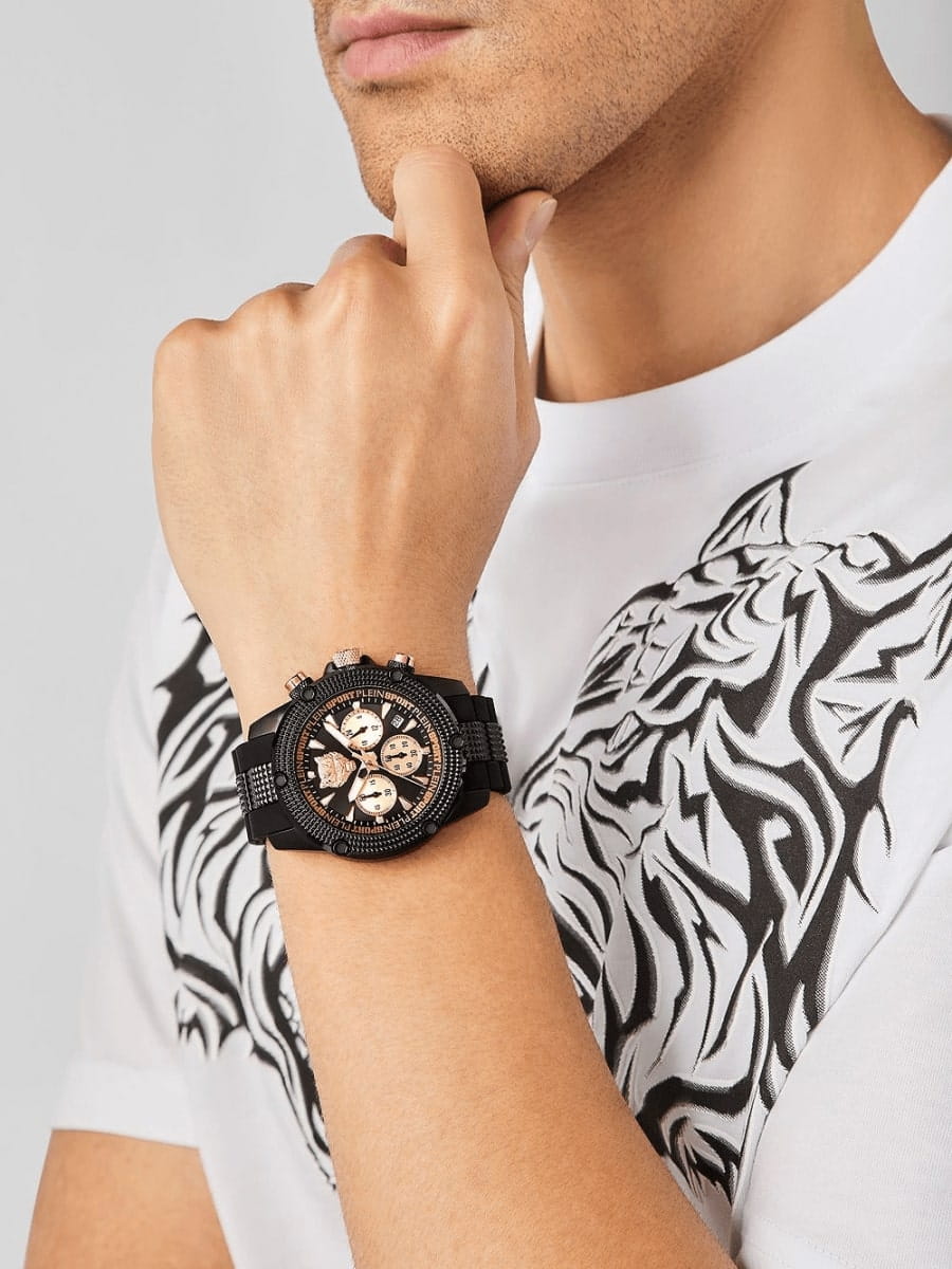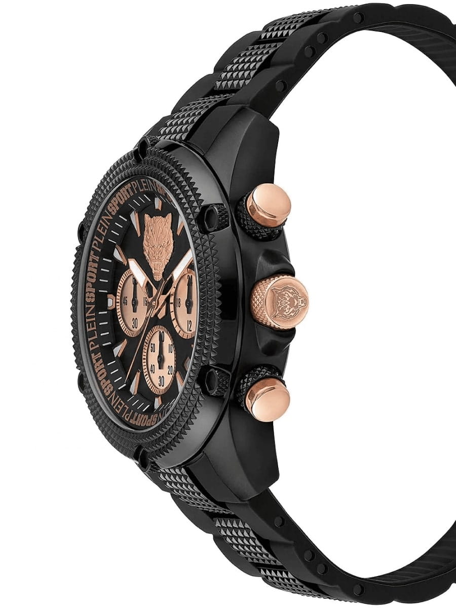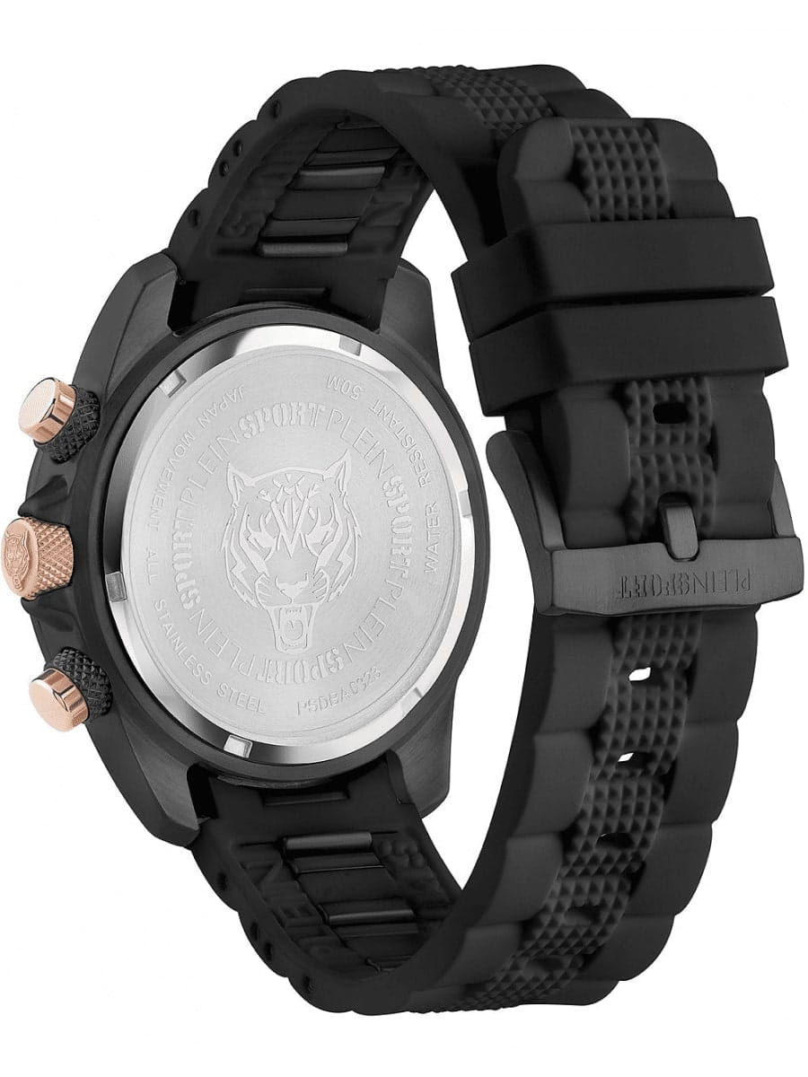 Немецкие мужские кварцевые часы-хронографХронографФункция позволяет измерять отрезки времени с особой точностью: часы, минуты, секунды. Верным признаком хронографа является наличие на циферблате 3 дополнительных окошек-счётчиков. с секундомеромСекундомерСекундоме́р — прибор, способный измерять интервалы времени с точностью до долей секунды. Plein Sport Hurricane PSDBA0323, кварцевый механизм с высокой точностью. Класс водозащиты: 50 метров, позволит защитить корпус от случайных брызг или капель дождя. Корпус выполнен из стали с IP-покрытиемIP-покрытиеМетод ионного напыления. Демонстрирует повышенную устойчивость к истиранию, окислению и химическим веществам. Под воздействием высокого давления и температуры около 1500°C молекулы металла надёжно соединяются с частицами корпуса часов.. Силиконовый ремешок на стандартной застёжке. Минеральное стеклоМинеральное стеклоМинеральное стекло представляет собой искусственно выращенный минерал кварца. Такое стекло отличается особой устойчивостью к повреждениям и царапинам. Уступает по некоторым качествам сапфировому стеклу. устойчивое к мелким механическим повреждениям. Окошко даты находится в положении между 4 и 5 часов.