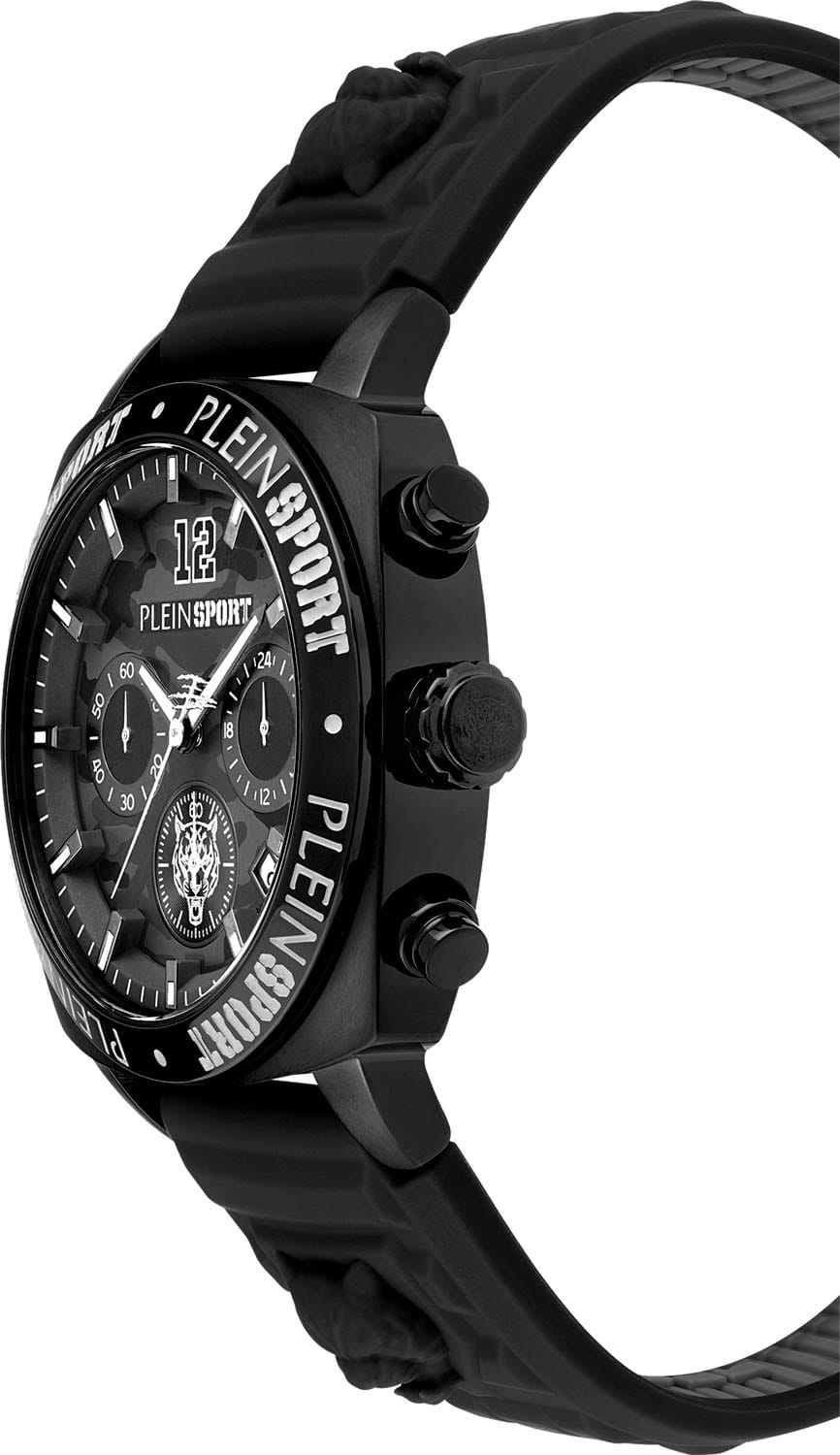 Немецкие мужские кварцевые часы-хронографХронографФункция позволяет измерять отрезки времени с особой точностью: часы, минуты, секунды. Верным признаком хронографа является наличие на циферблате 3 дополнительных окошек-счётчиков. с секундомеромСекундомерСекундоме́р — прибор, способный измерять интервалы времени с точностью до долей секунды. Plein Sport Wildcat PSGBA0523, кварцевый механизм с высокой точностью. Класс водозащиты: 50 метров, позволит защитить корпус от случайных брызг или капель дождя. Корпус часов изготовлен из стали с IP-покрытиемIP-покрытиеМетод ионного напыления. Демонстрирует повышенную устойчивость к истиранию, окислению и химическим веществам. Под воздействием высокого давления и температуры около 1500°C молекулы металла надёжно соединяются с частицами корпуса часов.. Стрелки и метки с люминесцентным покрытиемЛюминесцентное покрытиеПозволяет считывать показания времени в темноте. Производители наносят на стрелки, часовые индексы, безель или поверхность циферблата светонакопительный состав, дающий холодное свечение.. Силиконовый ремешок на стандартной застёжке. Окошко даты находится в положении между 4 и 5 часов.