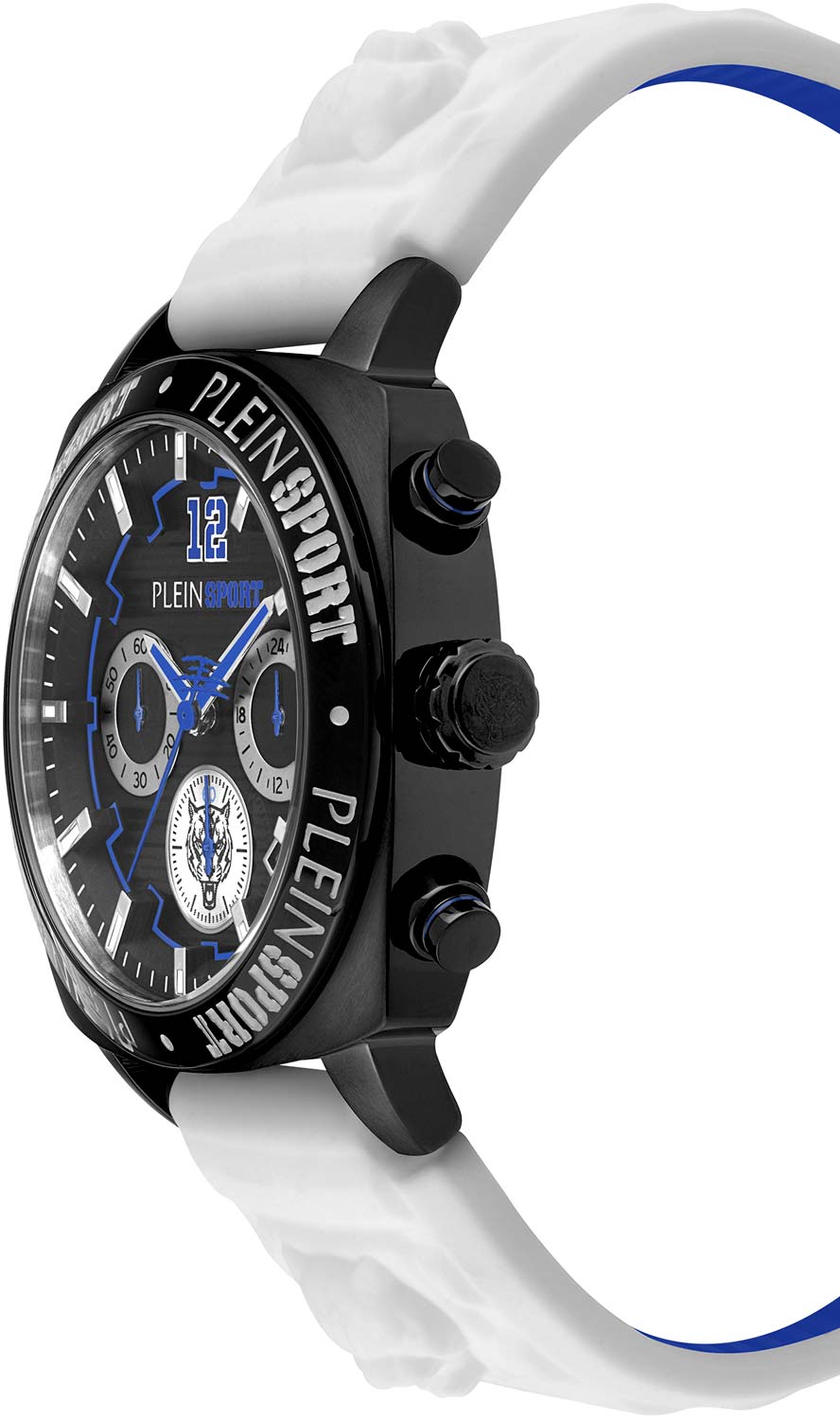 Немецкие мужские кварцевые часы-хронографХронографФункция позволяет измерять отрезки времени с особой точностью: часы, минуты, секунды. Верным признаком хронографа является наличие на циферблате 3 дополнительных окошек-счётчиков. с секундомеромСекундомерСекундоме́р — прибор, способный измерять интервалы времени с точностью до долей секунды. Plein Sport Wildcat PSGBA0823, кварцевый механизм с высокой точностью. Класс водозащиты: 50 метров, позволит защитить корпус от случайных брызг или капель дождя. Корпус часов изготовлен из стали с IP-покрытиемIP-покрытиеМетод ионного напыления. Демонстрирует повышенную устойчивость к истиранию, окислению и химическим веществам. Под воздействием высокого давления и температуры около 1500°C молекулы металла надёжно соединяются с частицами корпуса часов.. Стрелки и метки с люминесцентным покрытиемЛюминесцентное покрытиеПозволяет считывать показания времени в темноте. Производители наносят на стрелки, часовые индексы, безель или поверхность циферблата светонакопительный состав, дающий холодное свечение.. Силиконовый ремешок на стандартной застёжке. Окошко даты находится в положении между 4 и 5 часов.