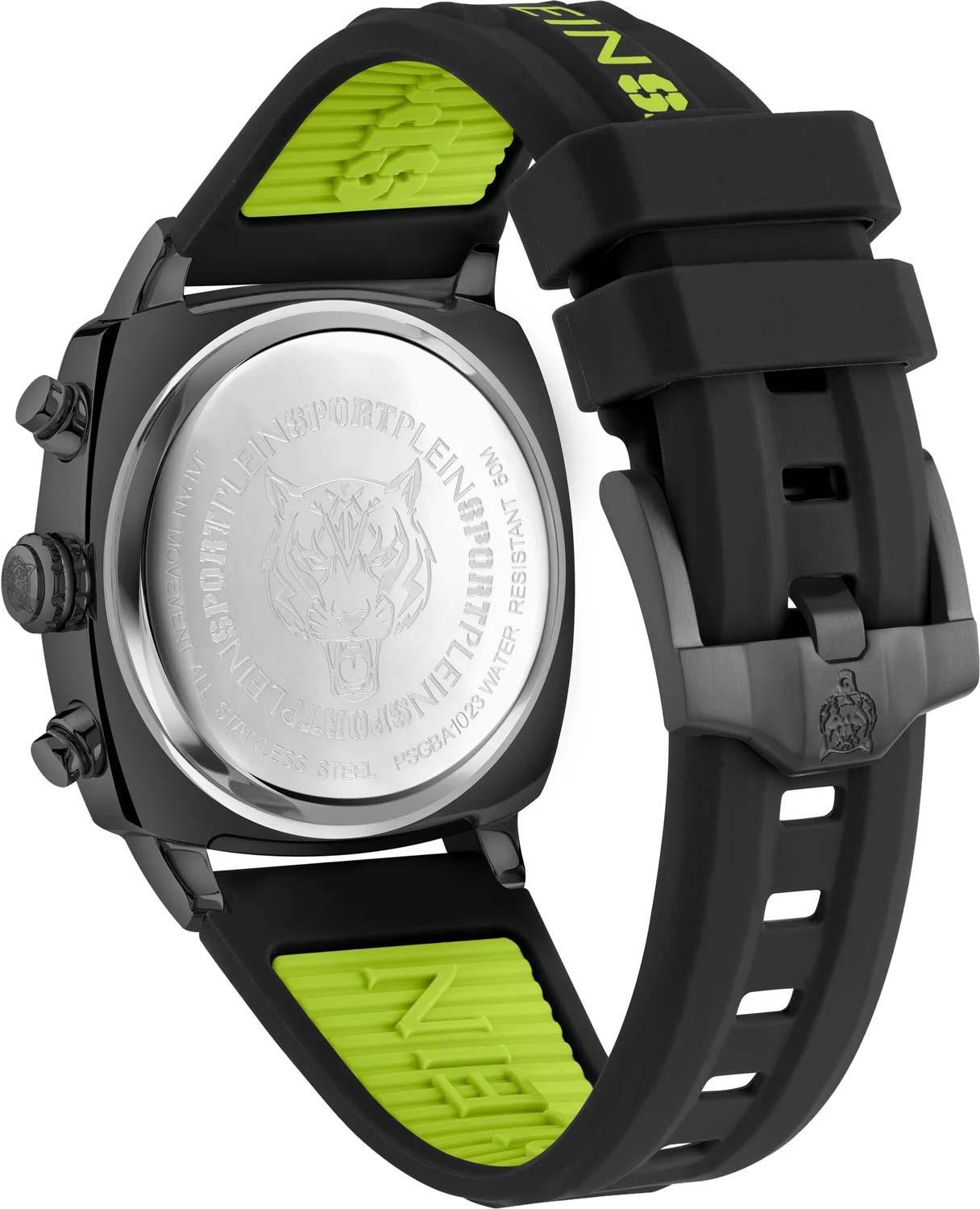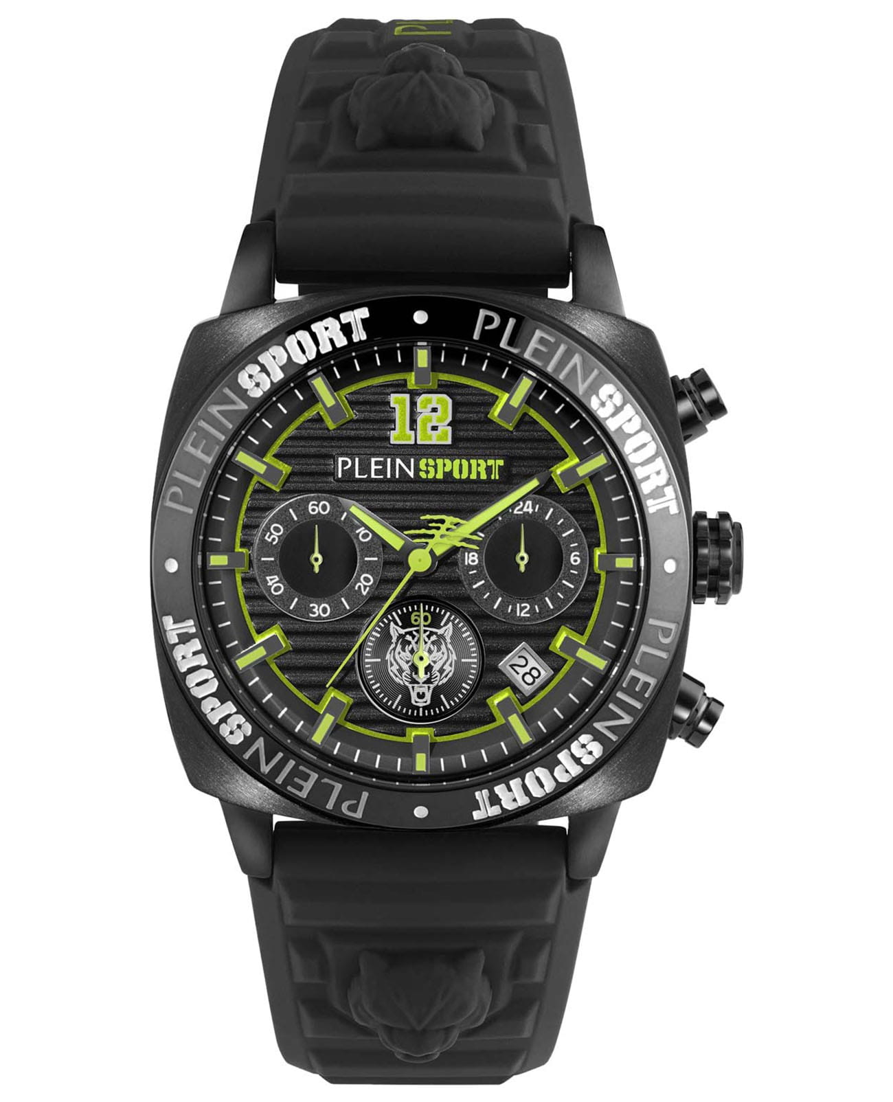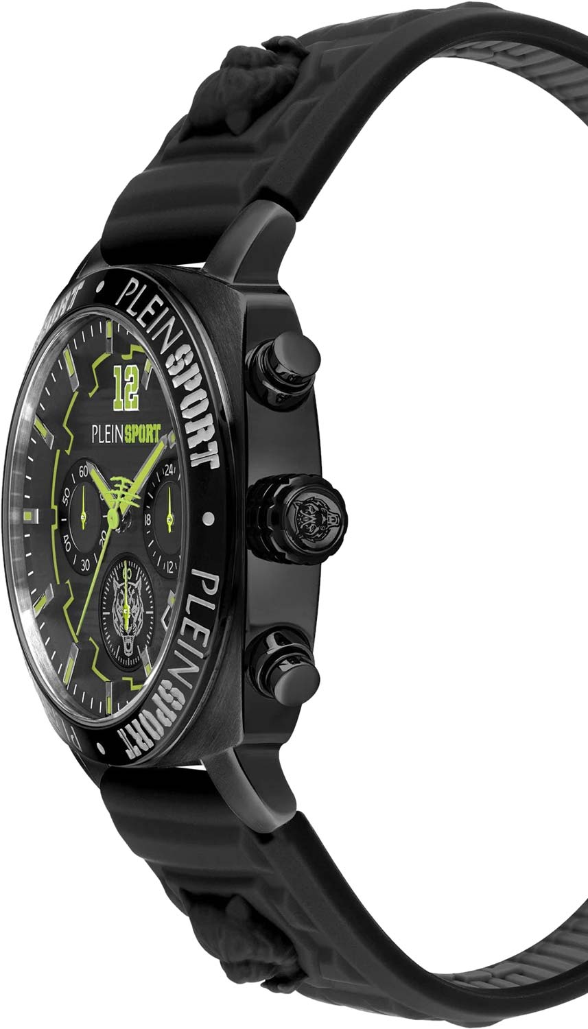 Немецкие мужские кварцевые часы-хронографХронографФункция позволяет измерять отрезки времени с особой точностью: часы, минуты, секунды. Верным признаком хронографа является наличие на циферблате 3 дополнительных окошек-счётчиков. с секундомеромСекундомерСекундоме́р — прибор, способный измерять интервалы времени с точностью до долей секунды. Plein Sport Wildcat PSGBA1023, кварцевый механизм с высокой точностью. Класс водозащиты: 50 метров, позволит защитить корпус от случайных брызг или капель дождя. Корпус часов изготовлен из стали с IP-покрытиемIP-покрытиеМетод ионного напыления. Демонстрирует повышенную устойчивость к истиранию, окислению и химическим веществам. Под воздействием высокого давления и температуры около 1500°C молекулы металла надёжно соединяются с частицами корпуса часов.. Стрелки и метки с люминесцентным покрытиемЛюминесцентное покрытиеПозволяет считывать показания времени в темноте. Производители наносят на стрелки, часовые индексы, безель или поверхность циферблата светонакопительный состав, дающий холодное свечение.. Силиконовый ремешок на стандартной застёжке. Окошко даты находится в положении между 4 и 5 часов.