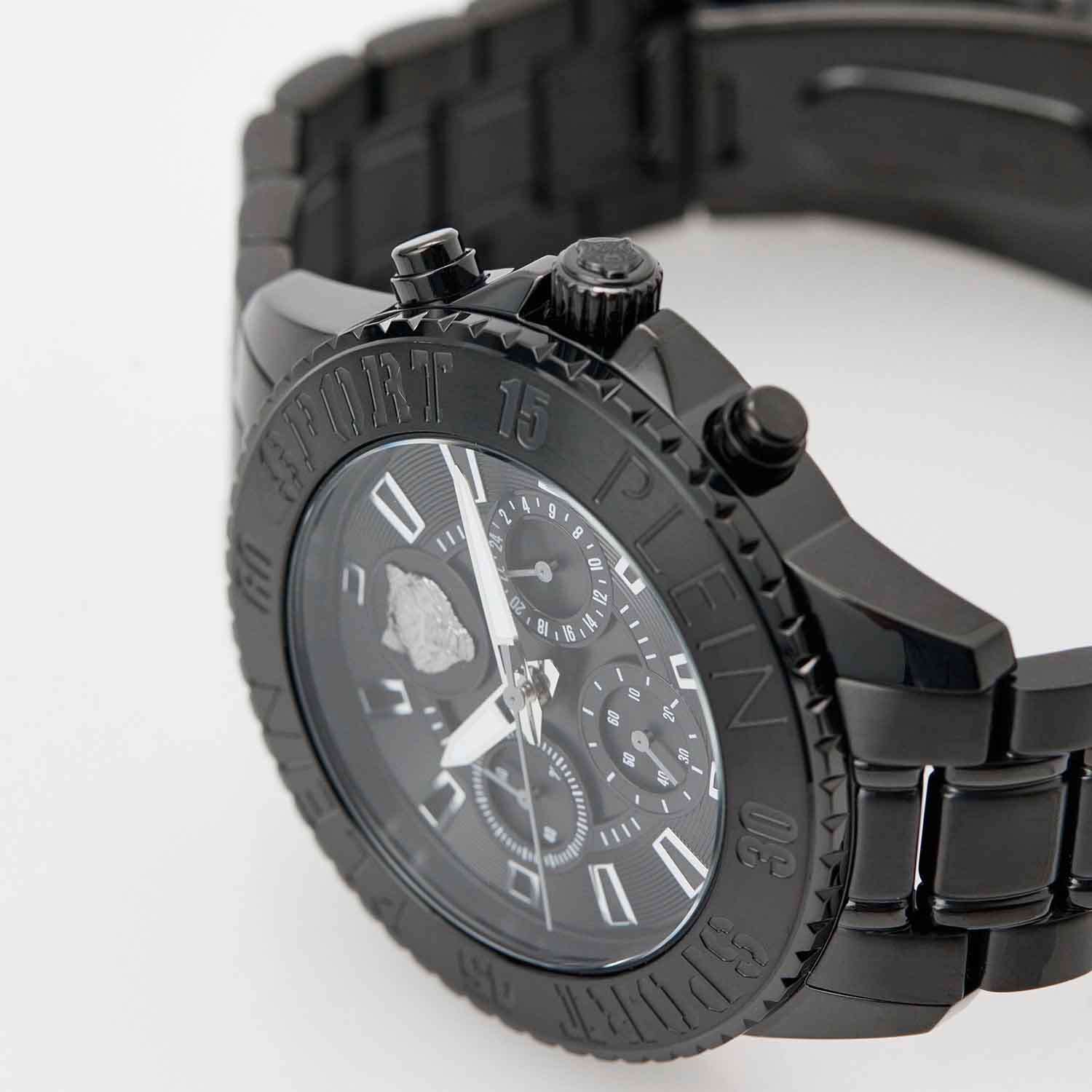 Дерзкий аксессуар со смелым, бунтарским дизайном будет с вами в любом приключении. Мужские кварцевые Plein Sport PSMEA0724 часы-хронографХронографФункция позволяет измерять отрезки времени с особой точностью: часы, минуты, секунды. Верным признаком хронографа является наличие на циферблате 3 дополнительных окошек-счётчиков.. Корпус и браслет часов изготовлены из стали с IP-покрытиемIP-покрытиеМетод ионного напыления. Демонстрирует повышенную устойчивость к истиранию, окислению и химическим веществам. Под воздействием высокого давления и температуры около 1500°C молекулы металла надёжно соединяются с частицами корпуса часов.. Циферблат дополнен паттерном ''след когтей''. Рифленая заводная головка с защитой. Класс водозащиты: 50 метров, позволит защитить корпус от случайных брызг или капель дождя.