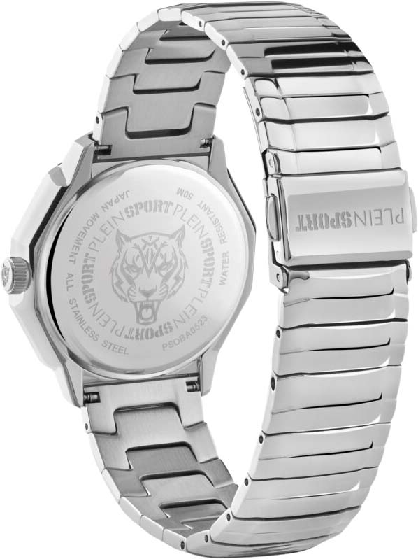 Немецкие кварцевые женские часы Plein Sport Dynasty PSOBA0523 с минеральным стекломМинеральное стеклоМинеральное стекло представляет собой искусственно выращенный минерал кварца. Такое стекло отличается особой устойчивостью к повреждениям и царапинам. Уступает по некоторым качествам сапфировому стеклу., кварцевый механизм с высокой точностью. Класс водозащиты: 50 метров, позволит защитить корпус от случайных брызг или капель дождя. Корпус часов изготовлен из стали. Стальной браслет на раскладной застёжкеРаскладная застёжкаТакой тип застёжки используется только на браслетах из металла. Она никогда не раскрывается полностью, происходит разделение на 2 и более частей. Раскладывающая застёжка снизит вероятность потери часов к минимуму..