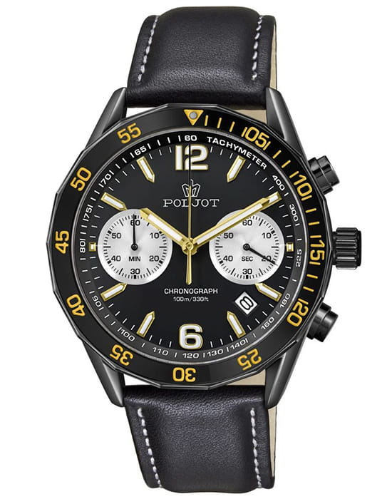 Poljot 6S21.184256 — яркие мужские часы с выразительным спортивным характером и акцентом на функциональность. Корпус из нержавеющей стали с PVD-покрытиемPVDУльтратонкое покрытие наносится в технике вакуумного напыления, сочетает в себе нитрид титана особой прочности со слоем золота или оксида хрома. Несёт в себе декоративную или защитную функцию. придаёт модели надёжность и солидность, а насыщенный циферблат с контрастными счётчиками хронографаХронографФункция позволяет измерять отрезки времени с особой точностью: часы, минуты, секунды. Верным признаком хронографа является наличие на циферблате 3 дополнительных окошек-счётчиков. создаёт динамичный и энергичный облик. БезельБезельВнешний ободок, закрепляющий стекло. В спортивных часах так называется поворотное кольцо с делениями на циферблате, выполняет роль таймера – замеряет отрезки времени на шкале. Неподвижный безель – элемент декора. Однонаправленно вращающийся безель на дайверских часах позволяет фиксировать моменты погружения и выныривания на поверхность. с PVD-покрытиемPVDУльтратонкое покрытие наносится в технике вакуумного напыления, сочетает в себе нитрид титана особой прочности со слоем золота или оксида хрома. Несёт в себе декоративную или защитную функцию.. Широкие стрелки и метки с люминесцентным покрытиемЛюминесцентное покрытиеПозволяет считывать показания времени в темноте. Производители наносят на стрелки, часовые индексы, безель или поверхность циферблата светонакопительный состав, дающий холодное свечение. обеспечивают отличную читаемость в любых условиях, а внешний обод с минутной шкалой подчёркивает спортивный стиль. Окно даты добавляет практичности. Прочное минеральное стеклоМинеральное стеклоМинеральное стекло представляет собой искусственно выращенный минерал кварца. Такое стекло отличается особой устойчивостью к повреждениям и царапинам. Уступает по некоторым качествам сапфировому стеклу. надёжно защищает циферблат от повреждений, а ремешок из натуральной кожи гармонично дополняет контрастную цветовую палитру. Poljot — это смелое сочетание спортивной энергии, точности и современного дизайна для активного и уверенного мужчины.