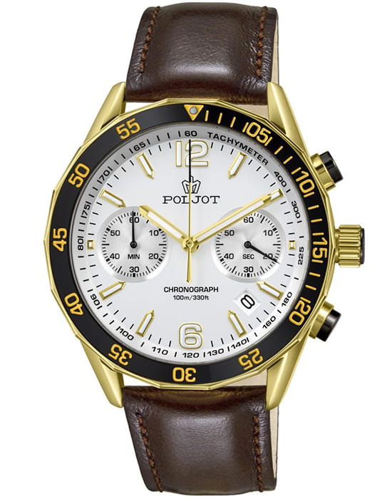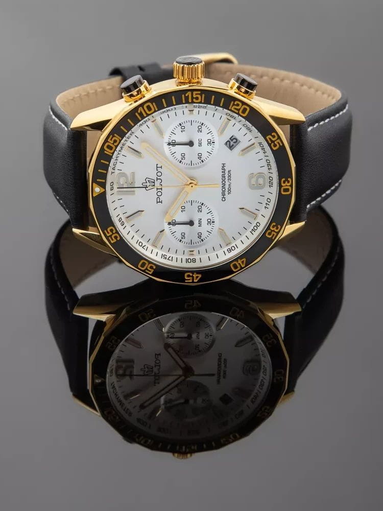 Poljot 6S21.186254 — яркие мужские часы с выразительным спортивным характером и акцентом на функциональность. Корпус из нержавеющей стали с PVD-покрытиемPVDУльтратонкое покрытие наносится в технике вакуумного напыления, сочетает в себе нитрид титана особой прочности со слоем золота или оксида хрома. Несёт в себе декоративную или защитную функцию. придаёт модели надёжность и солидность, а насыщенный циферблат с контрастными счётчиками хронографаХронографФункция позволяет измерять отрезки времени с особой точностью: часы, минуты, секунды. Верным признаком хронографа является наличие на циферблате 3 дополнительных окошек-счётчиков. создаёт динамичный и энергичный облик. БезельБезельВнешний ободок, закрепляющий стекло. В спортивных часах так называется поворотное кольцо с делениями на циферблате, выполняет роль таймера – замеряет отрезки времени на шкале. Неподвижный безель – элемент декора. Однонаправленно вращающийся безель на дайверских часах позволяет фиксировать моменты погружения и выныривания на поверхность. с PVD-покрытиемPVDУльтратонкое покрытие наносится в технике вакуумного напыления, сочетает в себе нитрид титана особой прочности со слоем золота или оксида хрома. Несёт в себе декоративную или защитную функцию.. Широкие стрелки и метки с люминесцентным покрытиемЛюминесцентное покрытиеПозволяет считывать показания времени в темноте. Производители наносят на стрелки, часовые индексы, безель или поверхность циферблата светонакопительный состав, дающий холодное свечение. обеспечивают отличную читаемость в любых условиях, а внешний обод с минутной шкалой подчёркивает спортивный стиль. Окно даты добавляет практичности. Прочное минеральное стеклоМинеральное стеклоМинеральное стекло представляет собой искусственно выращенный минерал кварца. Такое стекло отличается особой устойчивостью к повреждениям и царапинам. Уступает по некоторым качествам сапфировому стеклу. надёжно защищает циферблат от повреждений, а ремешок из натуральной кожи гармонично дополняет контрастную цветовую палитру. Poljot — это смелое сочетание спортивной энергии, точности и современного дизайна для активного и уверенного мужчины.