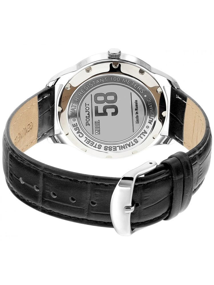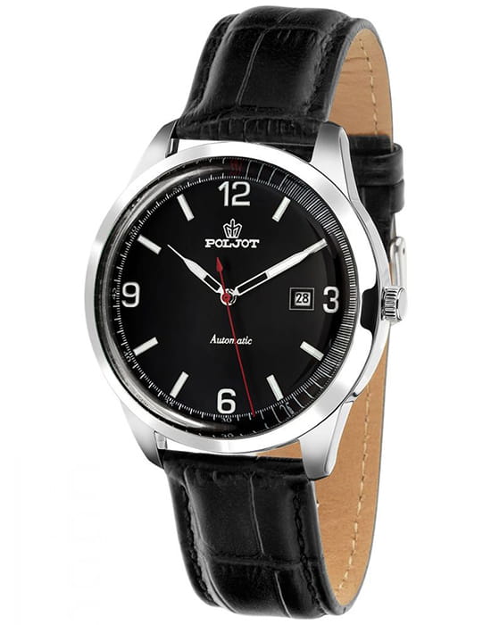 Poljot 8215.581019 — классические механические мужские часы с автоподзаводом, сочетающие традиции отечественного часового производства и лаконичный современный стиль. Корпус из нержавеющей стали подчёркивает надёжность и сдержанную элегантность модели, а глубокий циферблат с минималистичной разметкой, стрелки и метки с люминесцентным покрытиемЛюминесцентное покрытиеПозволяет считывать показания времени в темноте. Производители наносят на стрелки, часовые индексы, безель или поверхность циферблата светонакопительный состав, дающий холодное свечение., аккуратным окном даты и секундным акцентом придаёт образу динамичность. Механизм с автоподзаводом обеспечивает стабильную работу и плавный ход стрелок, подчёркивая инженерную точность исполнения. Прочное минеральное стеклоМинеральное стеклоМинеральное стекло представляет собой искусственно выращенный минерал кварца. Такое стекло отличается особой устойчивостью к повреждениям и царапинам. Уступает по некоторым качествам сапфировому стеклу. защищает циферблат, а ремешок из натуральной кожи с классической текстурой крокодила обеспечивает комфорт и благородный внешний вид. Poljot — воплощение надёжности, традиций и мужской элегантности, созданное для тех, кто ценит качество и уверенность в каждой детали.