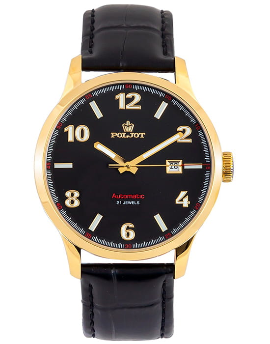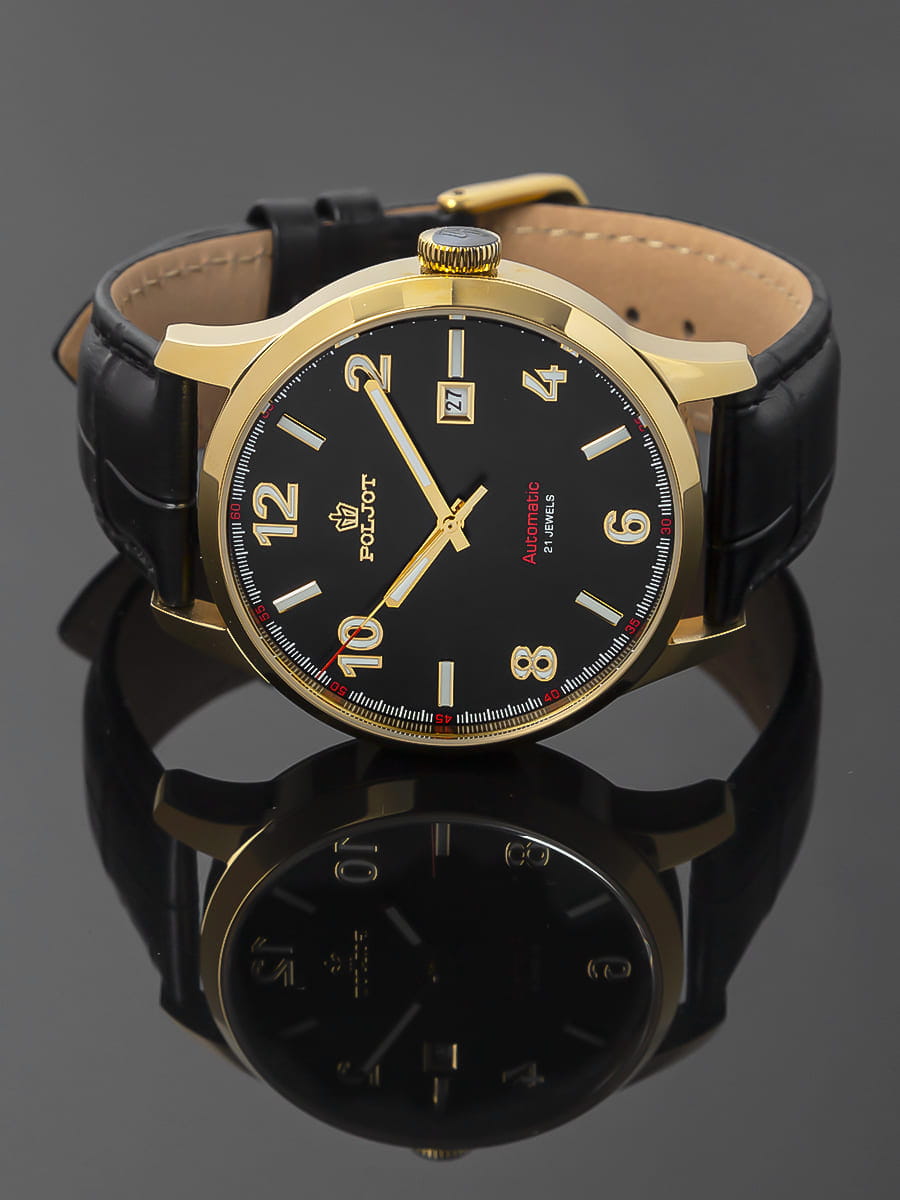 Poljot 8215.906219 — классические механические мужские часы с автоподзаводом, сочетающие сдержанный дизайн и надёжность российского часового производства. Корпус из нержавеющей стали с PVD-покрытиемPVDУльтратонкое покрытие наносится в технике вакуумного напыления, сочетает в себе нитрид титана особой прочности со слоем золота или оксида хрома. Несёт в себе декоративную или защитную функцию. подчёркивает строгость и универсальность модели, а циферблат с крупными арабскими цифрами и аккуратным окном даты на позиции «3 часов» обеспечивает превосходную читаемость. Стрелки и метки с люминесцентным покрытиемЛюминесцентное покрытиеПозволяет считывать показания времени в темноте. Производители наносят на стрелки, часовые индексы, безель или поверхность циферблата светонакопительный состав, дающий холодное свечение.. Механизм с автоподзаводом гарантирует стабильную работу и плавный ход стрелок. Прочное минеральное стеклоМинеральное стеклоМинеральное стекло представляет собой искусственно выращенный минерал кварца. Такое стекло отличается особой устойчивостью к повреждениям и царапинам. Уступает по некоторым качествам сапфировому стеклу. защищает циферблат от царапин, а ремешок из натуральной кожи придаёт часам современное и элегантное звучание. Poljot — это воплощение надёжности, классики и уверенного стиля, созданное для мужчин, предпочитающих традиционную механику и безупречный внешний вид.