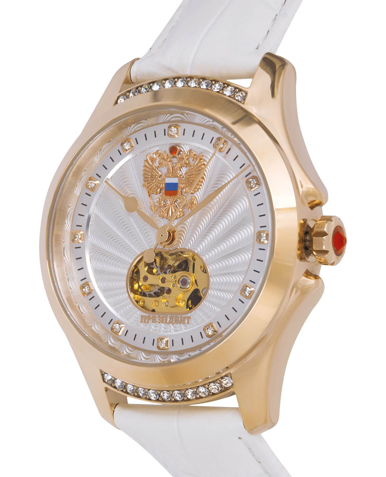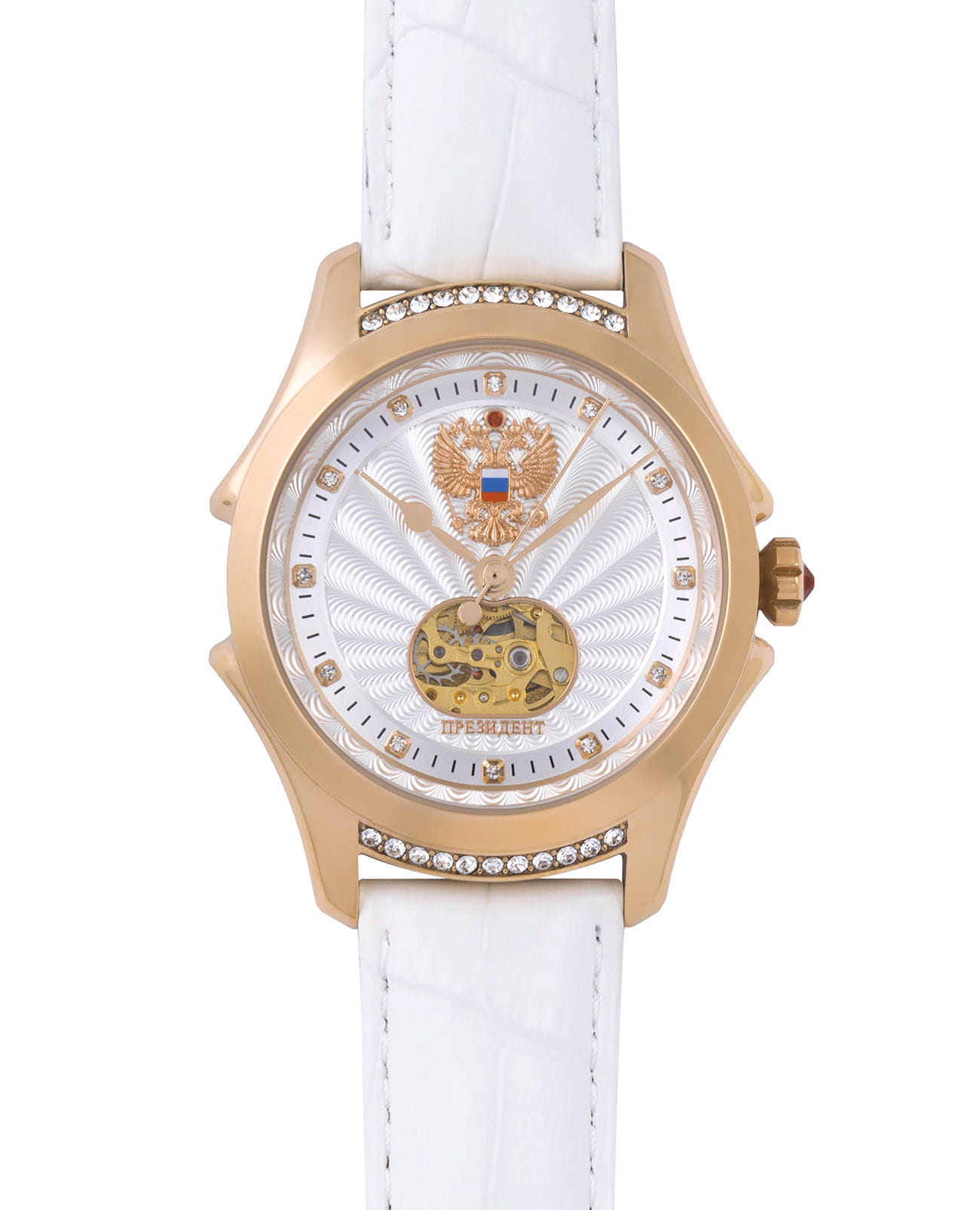 Стильные элегантные часы «Президент» — это идеальное дополнение к образу уверенной и целеустремлённой женщины. Модель выполнена в круглой форме с корпусом диаметром 39 мм и толщиной 11 мм, украшенным розовым золотом18-каратное золотоОбозначение по каратной системе пробирования, оно показывает, сколько драгоценного металла содержится в изделии. 18 карат - в составе 75% чистого золота, соответствует 750 пробе.