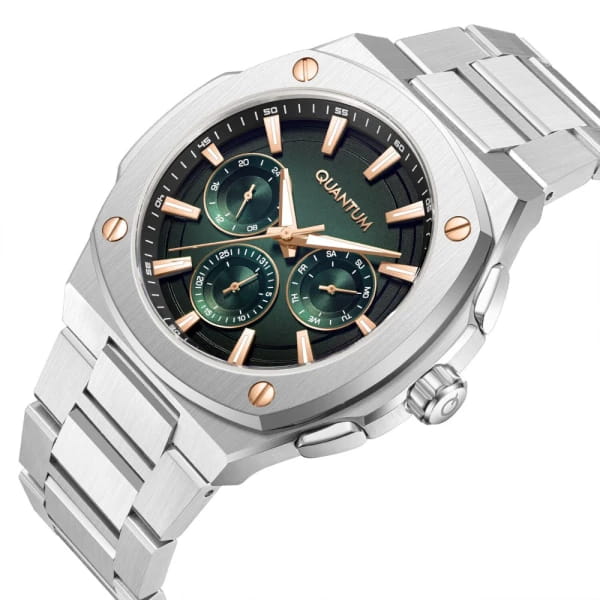 Quantum ADG1032.370 — это наручные часы, сочетающие в себе стиль, точность и надёжность. Модель выполнена в круглой форме из нержавеющей стали с минеральным стекломМинеральное стеклоМинеральное стекло представляет собой искусственно выращенный минерал кварца. Такое стекло отличается особой устойчивостью к повреждениям и царапинам. Уступает по некоторым качествам сапфировому стеклу., устойчивым к мелким повреждениям. Циферблат зелёного цвета оформлен штриховыми метками и оснащён функцией отображения даты, что делает его удобным для повседневного использования. Часы оснащены кварцевым механизмом, обеспечивающим высокую точность хода и минимальное обслуживание. Водонепроницаемость позволяет использовать их при плавании и других водных активностях без глубокого погружения. Стильная конструкция и универсальный дизайн делают модель подходящей для любого образа — от делового до неформального. Эти часы станут идеальным аксессуаром для тех, кто ценит сочетание элегантности, функциональности и надёжности — универсальное решение для повседневной носки и повседневных задач.
