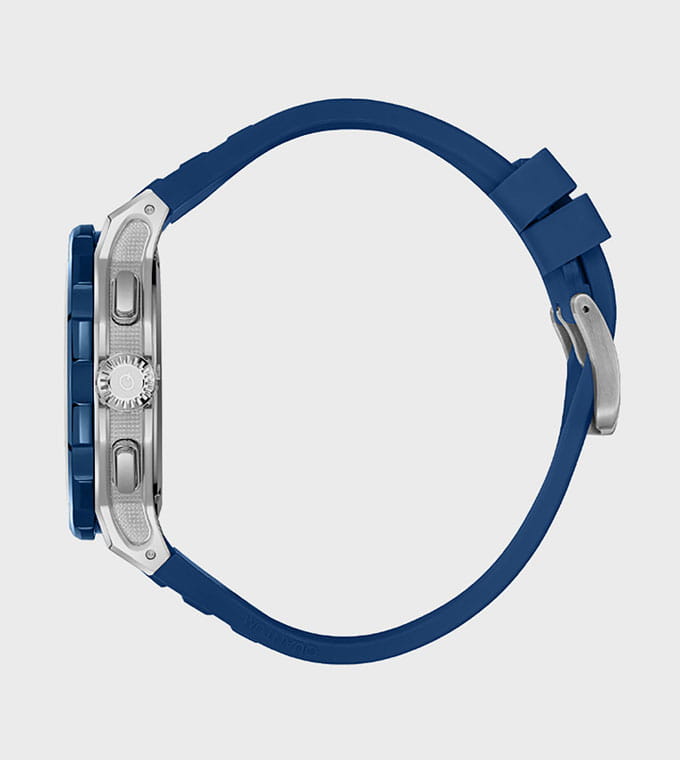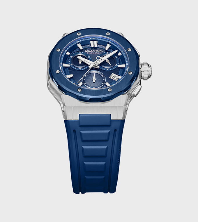 Мужские кварцевые часы Quantum из коллекции Hunter — круглый корпус размером 46 мм из нержавеющей стали, оснащённый функциями хронографаХронографФункция позволяет измерять отрезки времени с особой точностью: часы, минуты, секунды. Верным признаком хронографа является наличие на циферблате 3 дополнительных окошек-счётчиков., суточника и окошком даты. БезельБезельВнешний ободок, закрепляющий стекло. В спортивных часах так называется поворотное кольцо с делениями на циферблате, выполняет роль таймера – замеряет отрезки времени на шкале. Неподвижный безель – элемент декора. Однонаправленно вращающийся безель на дайверских часах позволяет фиксировать моменты погружения и выныривания на поверхность. из нержавеющей стали с PVD-покрытиемPVDУльтратонкое покрытие наносится в технике вакуумного напыления, сочетает в себе нитрид титана особой прочности со слоем золота или оксида хрома. Несёт в себе декоративную или защитную функцию.. Стекло — минеральноеМинеральное стеклоМинеральное стекло представляет собой искусственно выращенный минерал кварца. Такое стекло отличается особой устойчивостью к повреждениям и царапинам. Уступает по некоторым качествам сапфировому стеклу. с антибликовым покрытием. Механизм — японский кварцевый Seiko. Водонепроницаемость 100 м. Ремешок — синий силиконовый на стандартной застёжке. Идеальный выбор для тех, кто ценит турецкий дизайн и функциональный спортивный стиль.