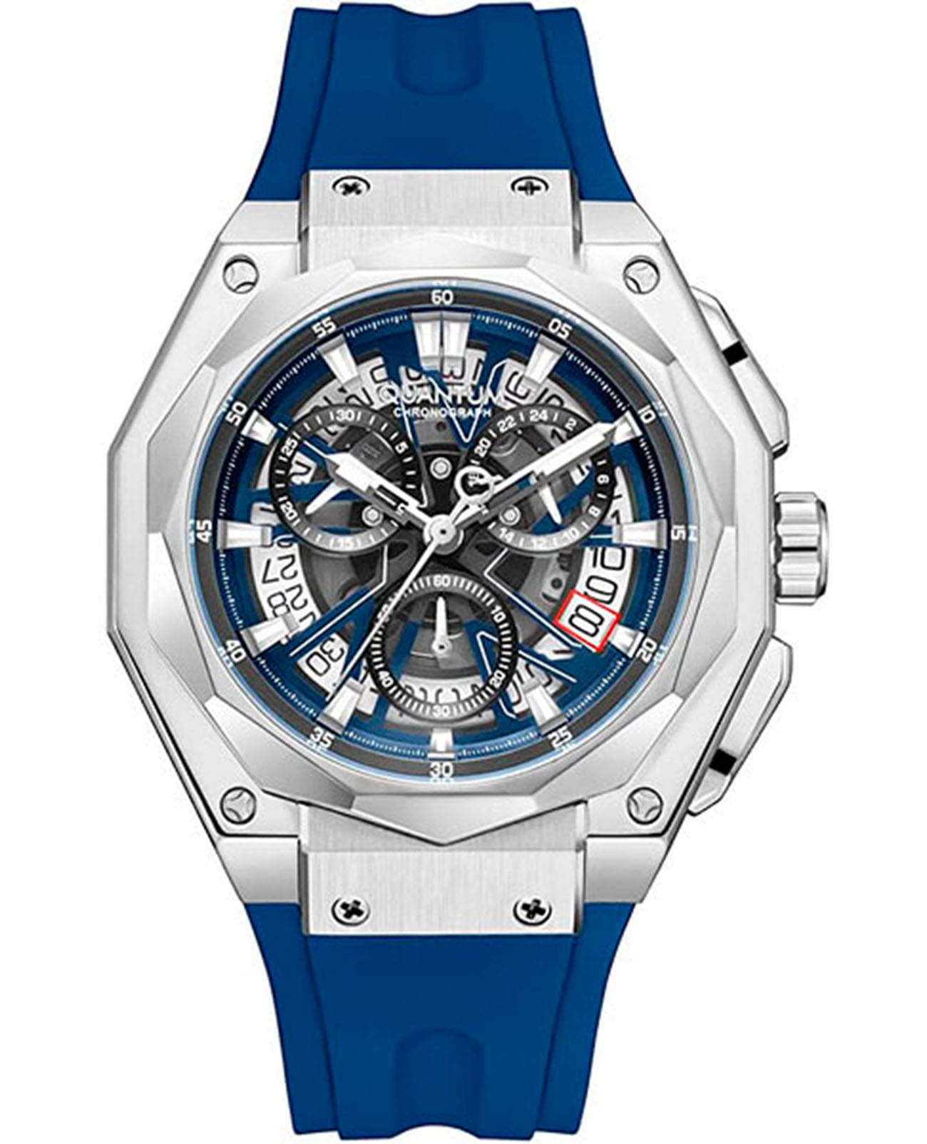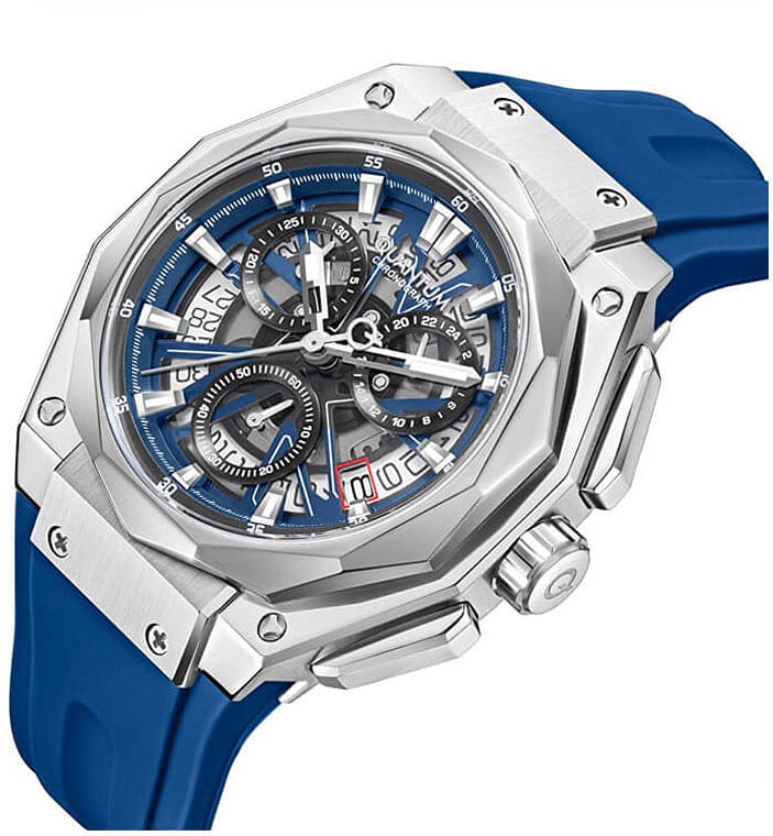 Мужские кварцевые часы Quantum HNG1097.359 из коллекции Hunter — круглый корпус размером 47 мм из нержавеющей стали, оснащённый функциями хронографаХронографФункция позволяет измерять отрезки времени с особой точностью: часы, минуты, секунды. Верным признаком хронографа является наличие на циферблате 3 дополнительных окошек-счётчиков. и окошком даты. Стрелки и метки с люминесцентным покрытиемЛюминесцентное покрытиеПозволяет считывать показания времени в темноте. Производители наносят на стрелки, часовые индексы, безель или поверхность циферблата светонакопительный состав, дающий холодное свечение.. Стекло — минеральноеМинеральное стеклоМинеральное стекло представляет собой искусственно выращенный минерал кварца. Такое стекло отличается особой устойчивостью к повреждениям и царапинам. Уступает по некоторым качествам сапфировому стеклу. с антибликовым покрытием. Механизм — японский кварцевый Seiko. Водонепроницаемость 100 м. Ремешок — синий силиконовый на стандартной застёжке. Идеальный выбор для тех, кто ценит турецкий дизайн и функциональный спортивный стиль.