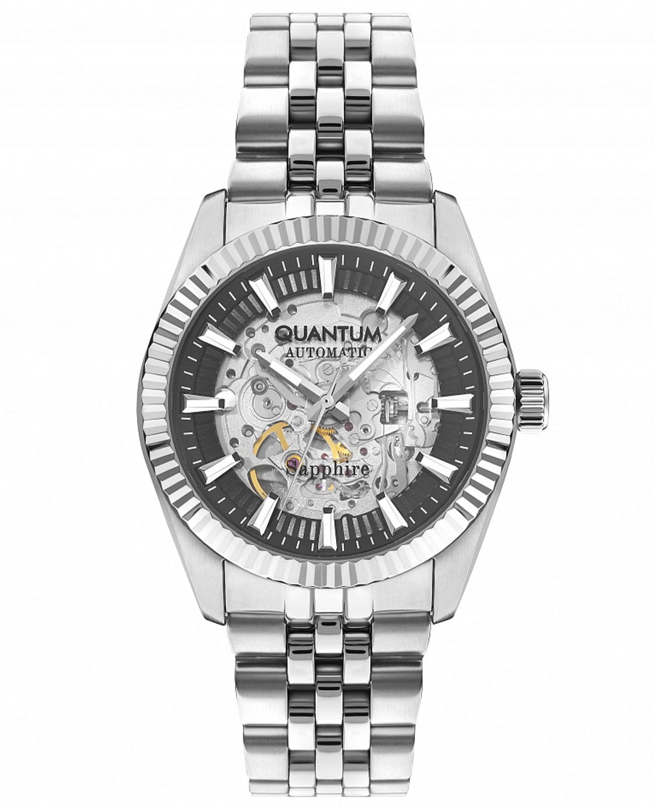Мужские наручные часы Quantum QMG1092.350, автоматический механизм с высокой точностью. Сапфировое стеклоСапфировое стеклоПрочный и надёжный материал из кристалла сапфира синтетического происхождения, характеризующийся особой твёрдостью и устойчивостью к царапинам и повреждениям. устойчивое к появлению царапин, обладающее высокой прозрачностью. Класс водозащиты: 50 метров, позволит защитить корпус от случайных брызг или капель дождя. Корпус часов изготовлен нержавеющей стали. Стрелки и метки с люминесцентным покрытиемЛюминесцентное покрытиеПозволяет считывать показания времени в темноте. Производители наносят на стрелки, часовые индексы, безель или поверхность циферблата светонакопительный состав, дающий холодное свечение.. Стальной браслет на застёжке-бабочке с кнопкамиЗастёжка "бабочка"Такой вид застёжки дополняется предохранителями, помогающими избежать случайного раскрытия браслета. Обладают изящным исполнением. .