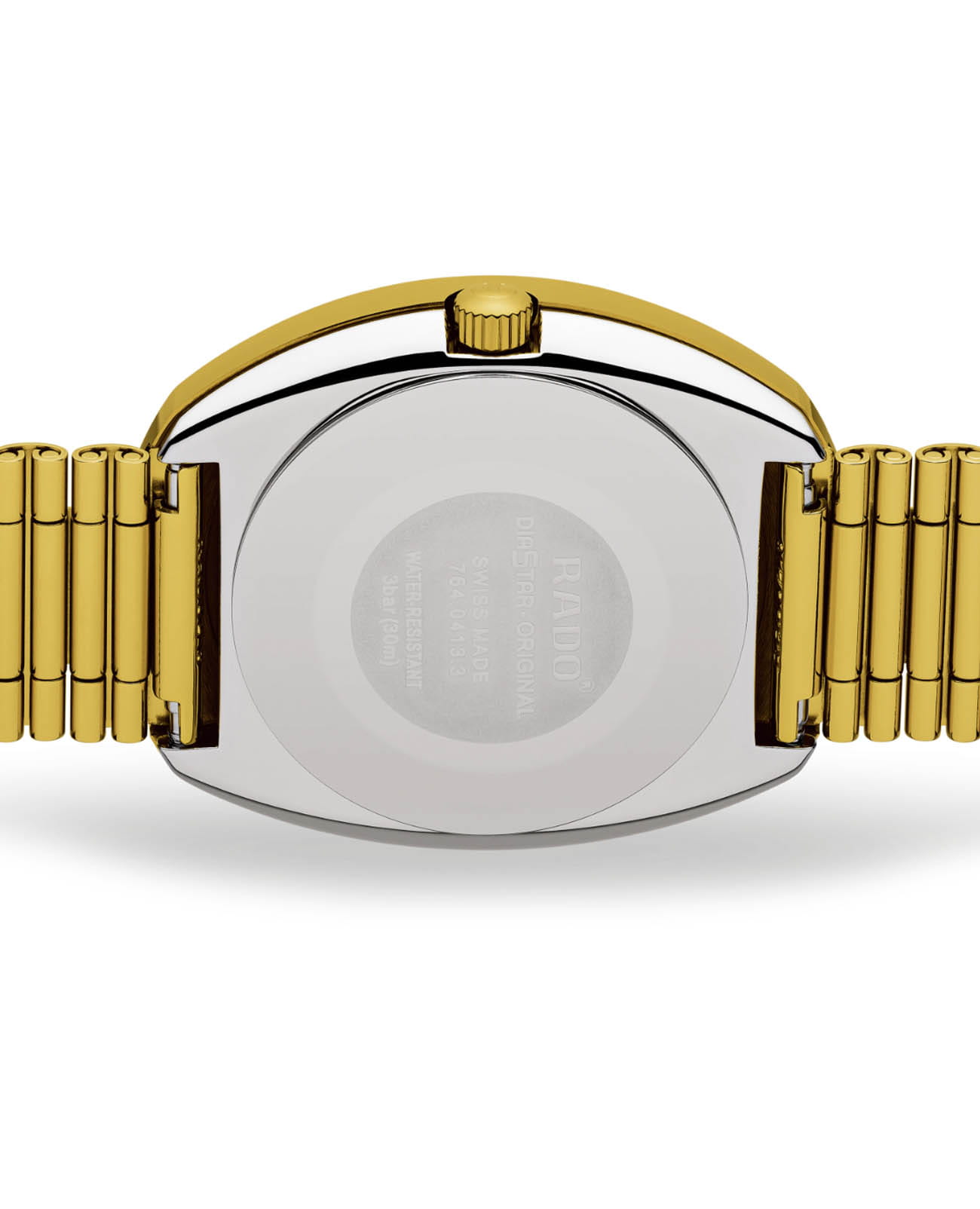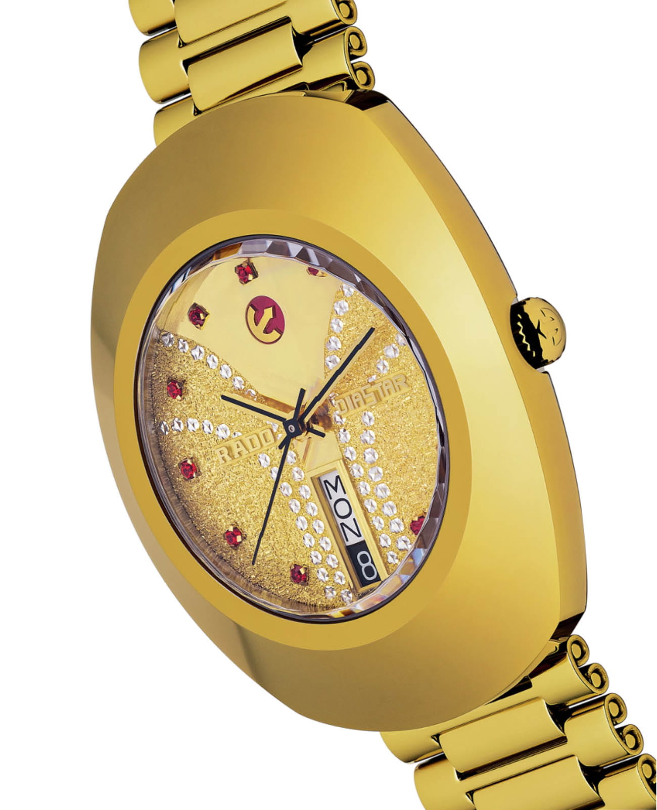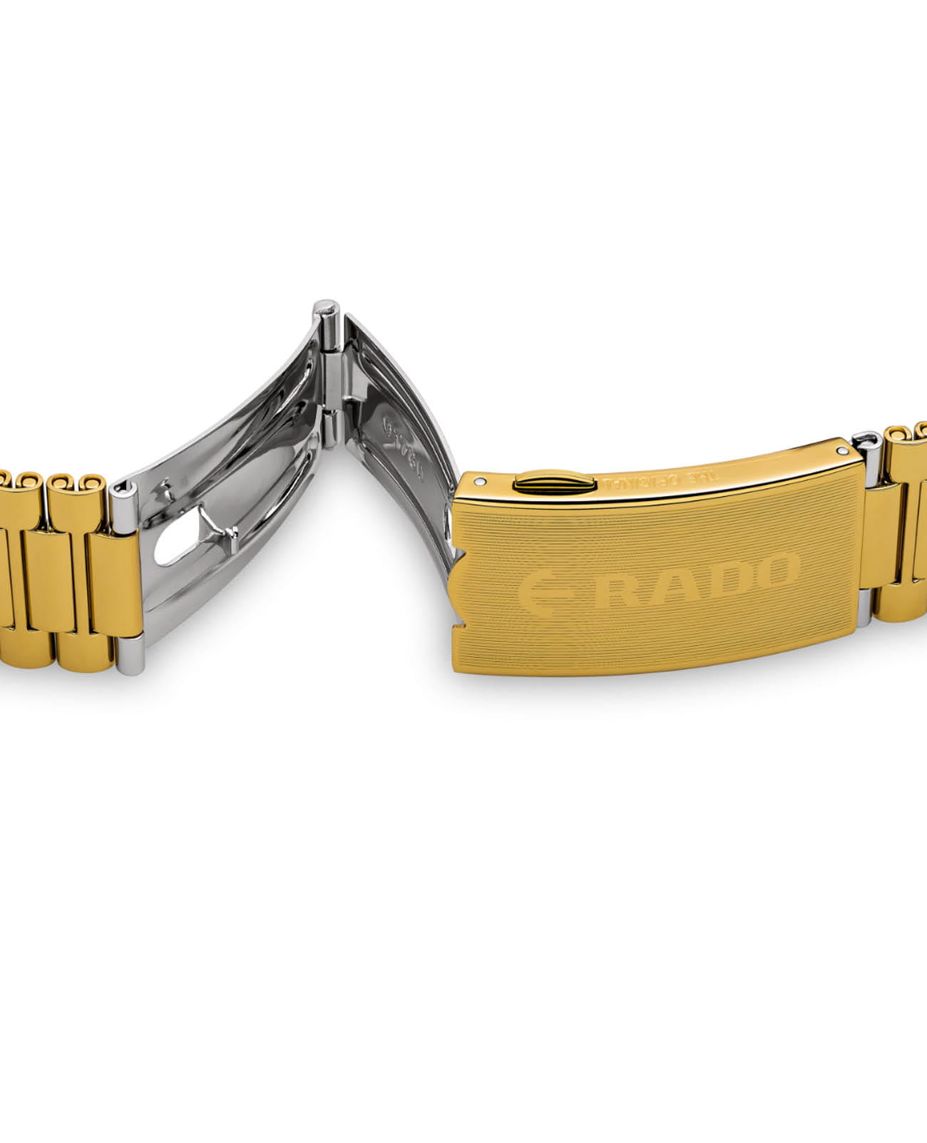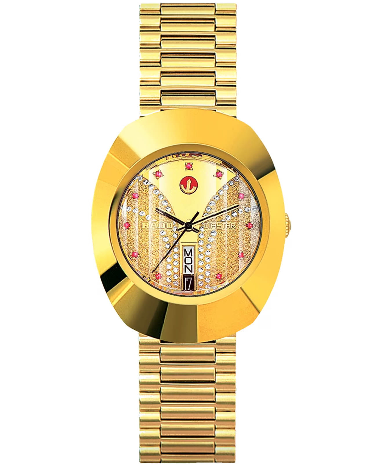 Мужские часы Rado The Original Automatic R12413033 с надёжным автоматическим механизмом. Корпус часов выполнен из нержавеющей стали c PVD-покрытиемPVDУльтратонкое покрытие наносится в технике вакуумного напыления, сочетает в себе нитрид титана особой прочности со слоем золота или оксида хрома. Несёт в себе декоративную или защитную функцию.. Стрелки с люминесцентным покрытиемЛюминесцентное покрытиеПозволяет считывать показания времени в темноте. Производители наносят на стрелки, часовые индексы, безель или поверхность циферблата светонакопительный состав, дающий холодное свечение. Super-LumiNova. Стальной браслет на раскладной застёжкеРаскладная застёжкаТакой тип застёжки используется только на браслетах из металла. Она никогда не раскрывается полностью, происходит разделение на 2 и более частей. Раскладывающая застёжка снизит вероятность потери часов к минимуму.. Класс водозащиты: 30 метров, позволит защитить корпус от случайных брызг или капель дождя. Циферблат инкрустирован сапфирами. Окошко даты и дня недели находятся в положении 6 часов.