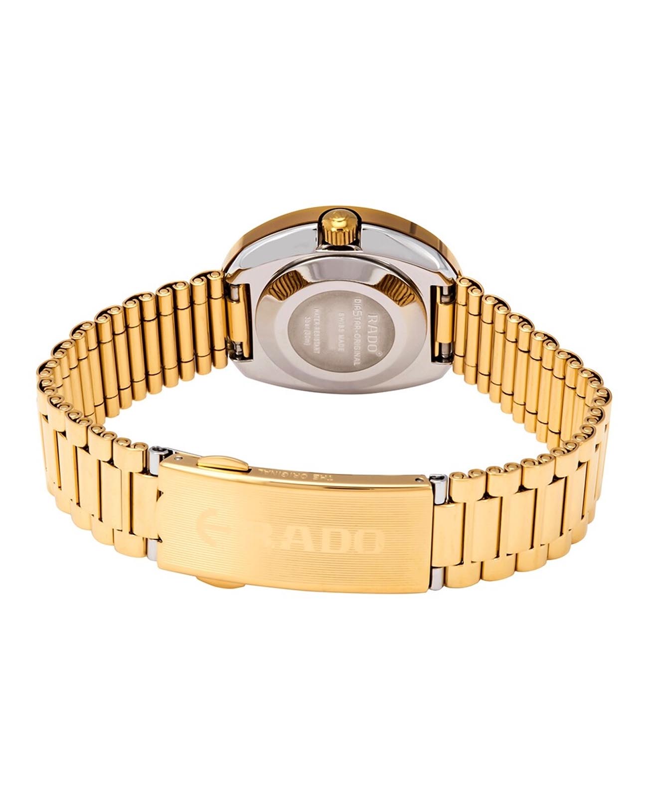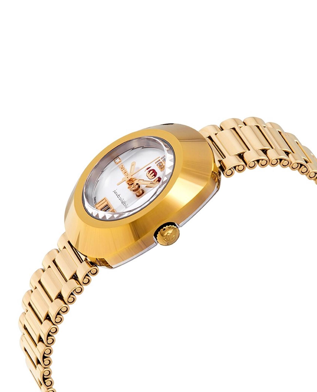 Женские механические швейцарские часы с автоподзаводом Rado The Original R12416034, кварцевый механизм с высокой точностью. Сапфировое стеклоСапфировое стеклоПрочный и надёжный материал из кристалла сапфира синтетического происхождения, характеризующийся особой твёрдостью и устойчивостью к царапинам и повреждениям. устойчивое к появлению царапин, обладающее высокой прозрачностью. Корпус и браслет часов выполнены из нержавеющей стали c PVD-покрытиемPVDУльтратонкое покрытие наносится в технике вакуумного напыления, сочетает в себе нитрид титана особой прочности со слоем золота или оксида хрома. Несёт в себе декоративную или защитную функцию.. Циферблат инкрустирован бриллиантами. Класс водозащиты: 30 метров, позволит защитить корпус от случайных брызг или капель дождя. Браслет на раскладной застёжкеРаскладная застёжкаТакой тип застёжки используется только на браслетах из металла. Она никогда не раскрывается полностью, происходит разделение на 2 и более частей. Раскладывающая застёжка снизит вероятность потери часов к минимуму..