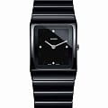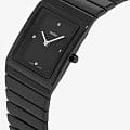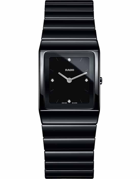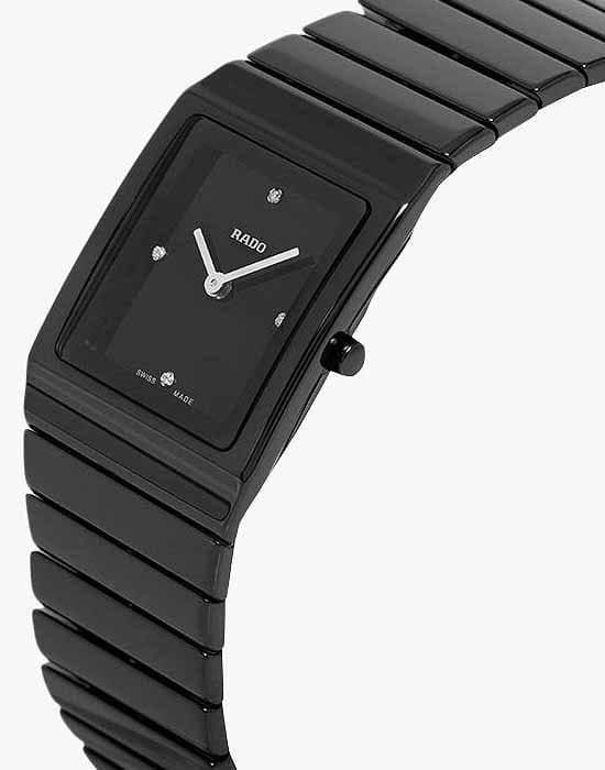 Чёрный прямоугольный циферблат с серебристыми стрелками находится в обрамлении надёжного керамического корпуса. В качестве украшения используются 4 бриллианта в 0,011 карат, драгоценные камни добавляют красоты и изящества. Чёткие геометрические формы. Кварцевый швейцарский механизм ETA 282.001 с высокой точностью хода. Использование высокотехнологичной керамикиВысокотехнологичная керамикаИнновационный запатентованный Rado материал с гладкой или матовой поверхностью. Керамика за счёт кристаллической структуры обладает повышенной устойчивостью от возникновения царапин. Материал способен принимать температуру тела человека, обеспечивая невероятный комфорт при ношении.. Стекло из сапфира. Водонепроницаемость при давлении 5 бар. Габариты: 31,7 x 22,9 x 6,6 мм.
