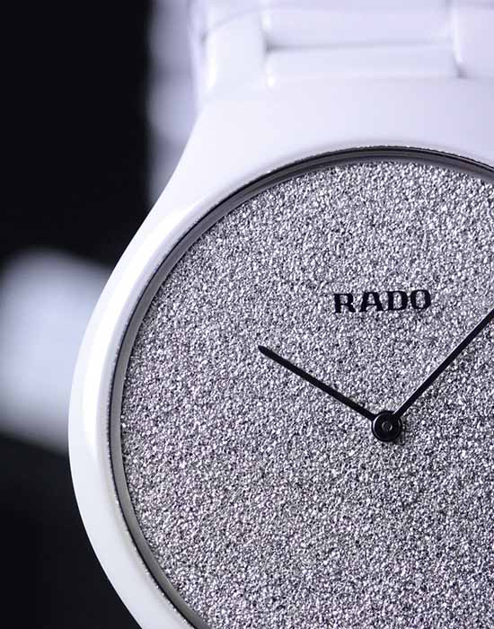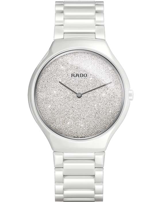 Ультратонкие часы (5 мм) отличается необычным циферблатом с мерцающей зерненой структурой. Это эксклюзивный аксессуар, способный приковывать взгляды окружающих. Швейцарский кварцевый механизм ETA 282.001 (толщина – 1 мм). Корпус и браслет из белой высокотехнологичной керамикиВысокотехнологичная керамикаИнновационный запатентованный Rado материал с гладкой или матовой поверхностью. Керамика за счёт кристаллической структуры обладает повышенной устойчивостью от возникновения царапин. Материал способен принимать температуру тела человека, обеспечивая невероятный комфорт при ношении.. Водонепроницаемость 3 бар. Сапфировое стекло. . Диаметр корпуса: 39 мм.