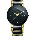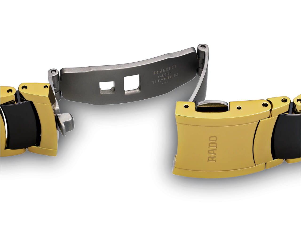 Наручные часы представляют собой воплощение классики и лаконичного дизайна, это идеальный вариант для поддержания солидного имиджа. Они выполнены из нержавеющей стали и высокотехнологичной керамикиВысокотехнологичная керамикаИнновационный запатентованный Rado материал с гладкой или матовой поверхностью. Керамика за счёт кристаллической структуры обладает повышенной устойчивостью от возникновения царапин. Материал способен принимать температуру тела человека, обеспечивая невероятный комфорт при ношении., чёрные вставки привлекательно смотрятся. Минималистичный циферблат инкрустирован 4 бриллиантами в 0,009 карат. Кварцевый калибр ETA 956.112 с высокой точностью хода. PVD-покрытиеPVDУльтратонкое покрытие наносится в технике вакуумного напыления, сочетает в себе нитрид титана особой прочности со слоем золота или оксида хрома. Несёт в себе декоративную или защитную функцию. цвета "жёлтое золото". Сапфировое стеклоСапфировое стеклоПрочный и надёжный материал из кристалла сапфира синтетического происхождения, характеризующийся особой твёрдостью и устойчивостью к царапинам и повреждениям. противостоит образованию царапин на поверхности. Диаметр корпуса: 28 мм.