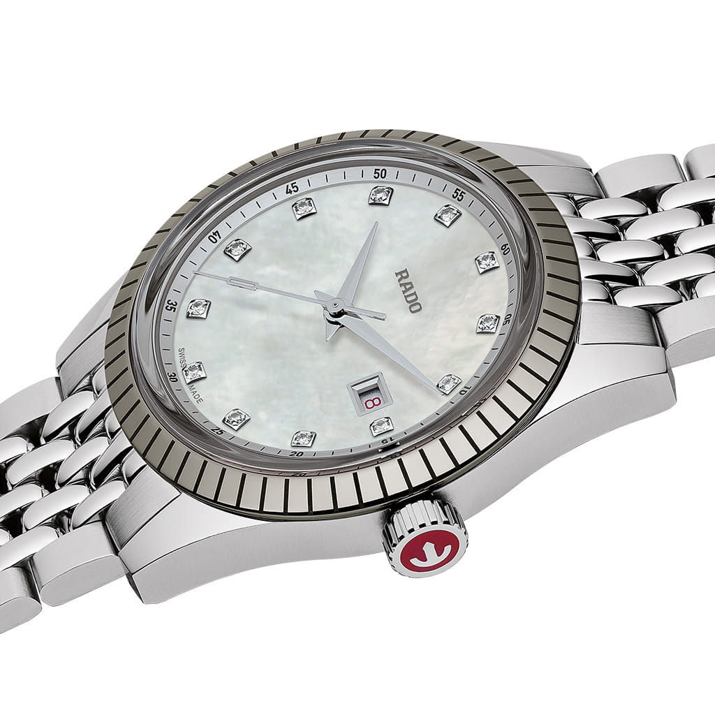 Женские швейцарские часы с надёжным кварцевым механизмом Rado Hyperchrome R33104923. Сапфировое стеклоСапфировое стеклоПрочный и надёжный материал из кристалла сапфира синтетического происхождения, характеризующийся особой твёрдостью и устойчивостью к царапинам и повреждениям. устойчивое к мелким механическим повреждениям. Корпус и браслет часов изготовлены из нержавеющей стали. Стальной браслет на раскладной застёжкеРаскладная застёжкаТакой тип застёжки используется только на браслетах из металла. Она никогда не раскрывается полностью, происходит разделение на 2 и более частей. Раскладывающая застёжка снизит вероятность потери часов к минимуму.. Окошко даты находится в положении 3 часа. Класс водозащиты: 50 метров, позволит защитить корпус от случайных брызг или капель дождя. Циферблат инкрустирован бриллиантами. БезельБезельВнешний ободок, закрепляющий стекло. В спортивных часах так называется поворотное кольцо с делениями на циферблате, выполняет роль таймера – замеряет отрезки времени на шкале. Неподвижный безель – элемент декора. Однонаправленно вращающийся безель на дайверских часах позволяет фиксировать моменты погружения и выныривания на поверхность. из высокотехнологичной плазменной керамикиВысокотехнологичная плазменная керамикаИнновационный материал, технология запатентована. Выплавление керамики осуществляется в печи при 20 000 °C, белоснежный материал под воздействием ультравысокой температуры приобретает уникальный блеск, присущий металлам..