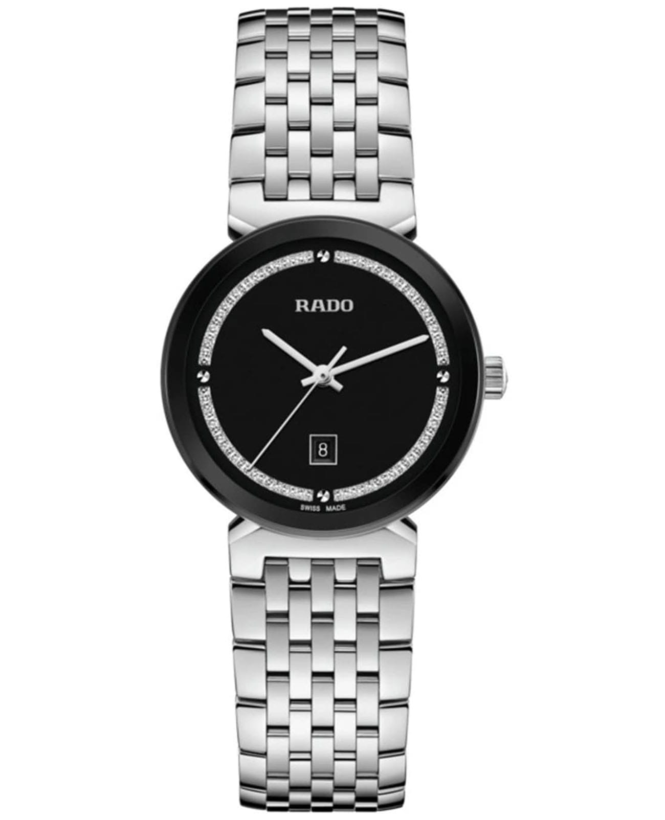 Женские швейцарские кварцевые часы Rado Florence Classic R48913163, кварцевый механизм с высокой точностью. Сапфировое стеклоСапфировое стеклоПрочный и надёжный материал из кристалла сапфира синтетического происхождения, характеризующийся особой твёрдостью и устойчивостью к царапинам и повреждениям. устойчивое к появлению царапин, обладающее высокой прозрачностью. Класс водозащиты: 50 метров, позволит защитить корпус от случайных брызг или капель дождя. Корпус и браслет часов изготовлены из стали. БезельБезельВнешний ободок, закрепляющий стекло. В спортивных часах так называется поворотное кольцо с делениями на циферблате, выполняет роль таймера – замеряет отрезки времени на шкале. Неподвижный безель – элемент декора. Однонаправленно вращающийся безель на дайверских часах позволяет фиксировать моменты погружения и выныривания на поверхность. с PVD-покрытиемPVDУльтратонкое покрытие наносится в технике вакуумного напыления, сочетает в себе нитрид титана особой прочности со слоем золота или оксида хрома. Несёт в себе декоративную или защитную функцию.. Окошко даты находится в положении 6 часов.